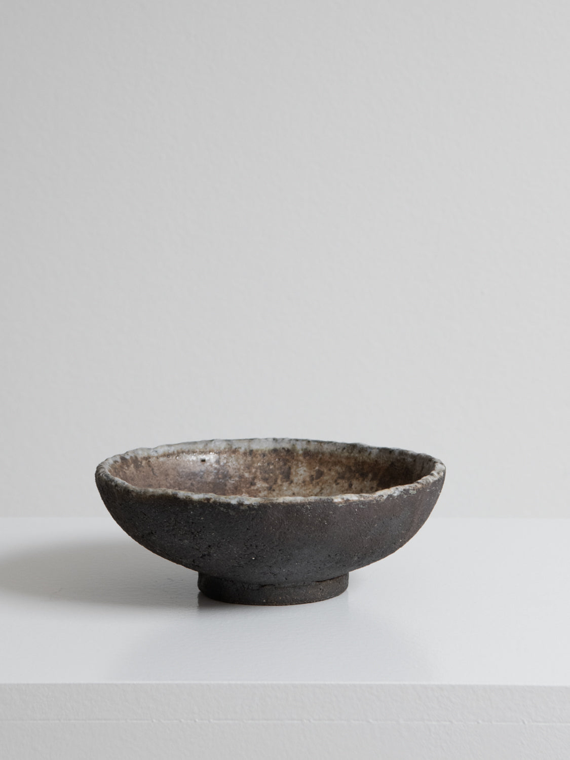 En håndbygget stentøjsskål af Helle Bovbjerg. Den rå kant og den askebrændte overflade giver værket et naturligt og taktilt udtryk.