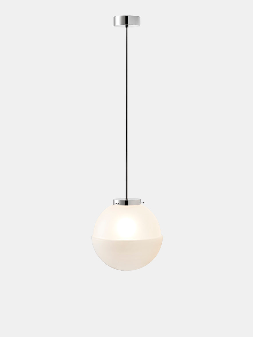 Crafted with precision, the ceiling lamp features nickel-plated metal and a half-opal, half-matt glass ball. Available in ball diameters of 25 cm or 40 cm, each lamp proudly carries the Tecnolumen/Bauhaus logo, representing its unique connection to Bauhaus heritage.