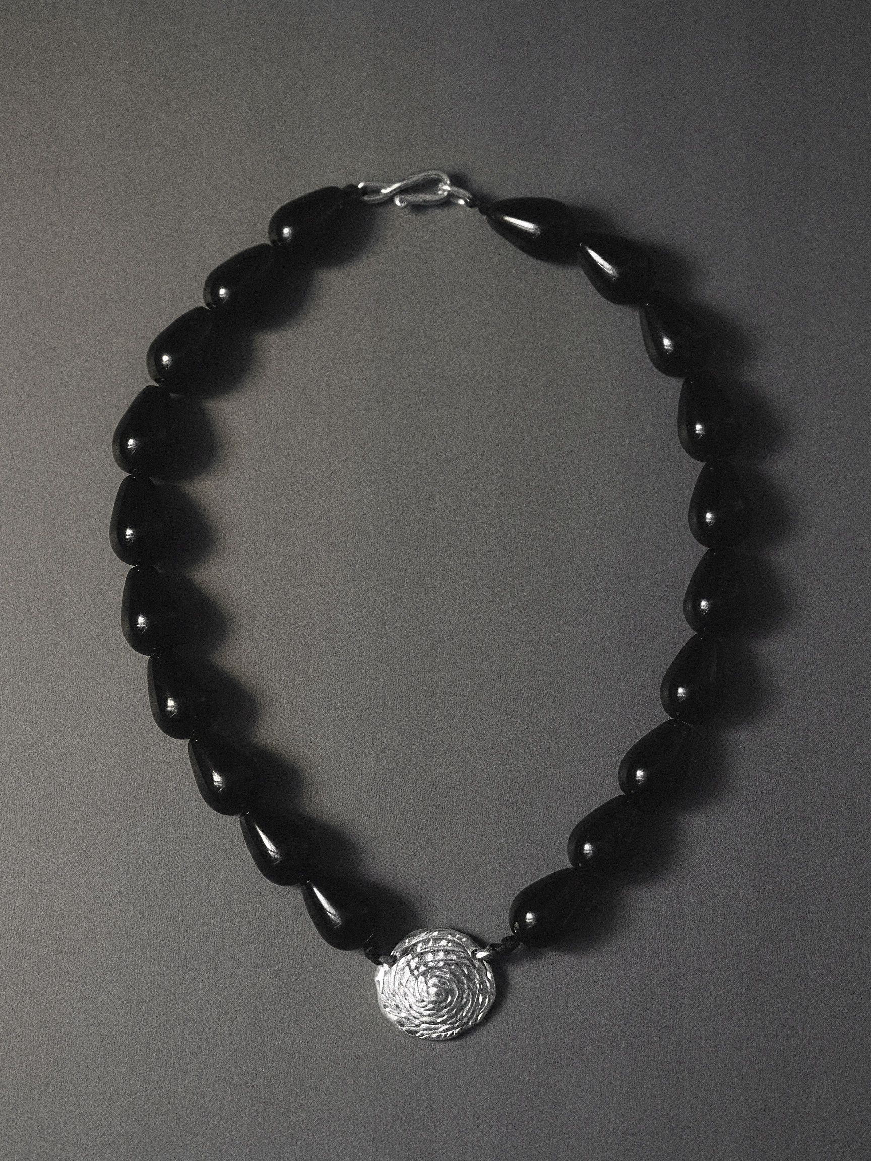 A beaded handmade necklace assembled with onyx stones and finished with a rose bud pendant in recycled sterling silver. Part of the Cadence collection, launched for Autumn/Winter 2025. Available for pre-order with delivery in October.