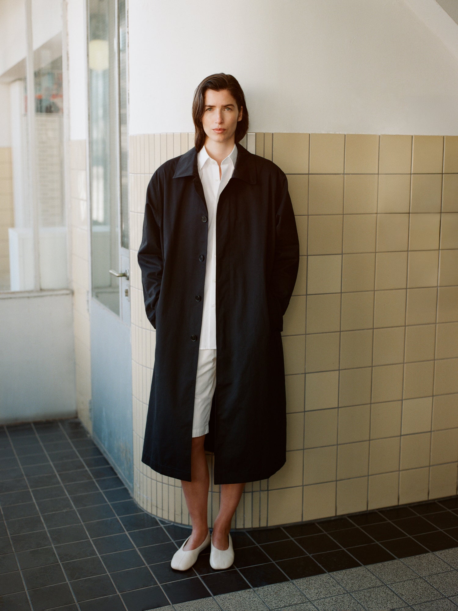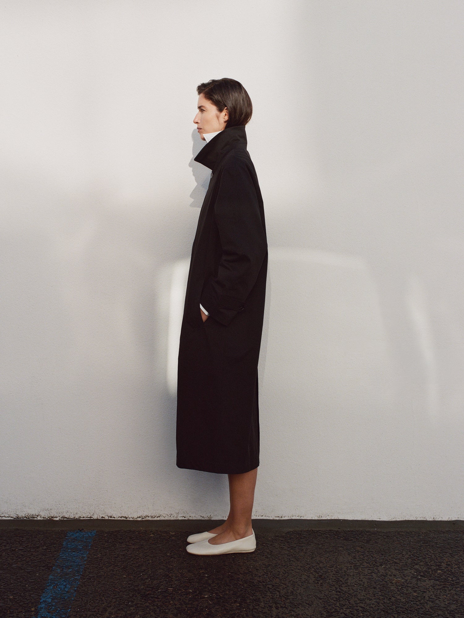 The Car Coat in black is cut from crisp cotton and half-lined in cotton for ease and movement. Designed with an oversized, straight silhouette inspired by classic menswear outerwear, refined through minimal detailing and a horn button closure.