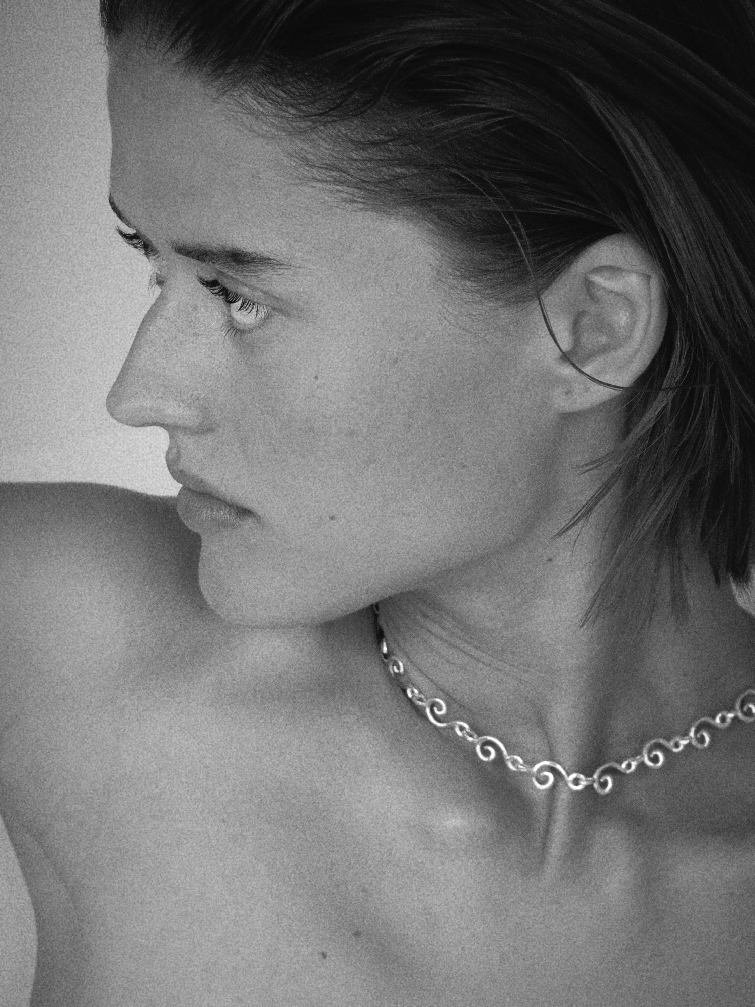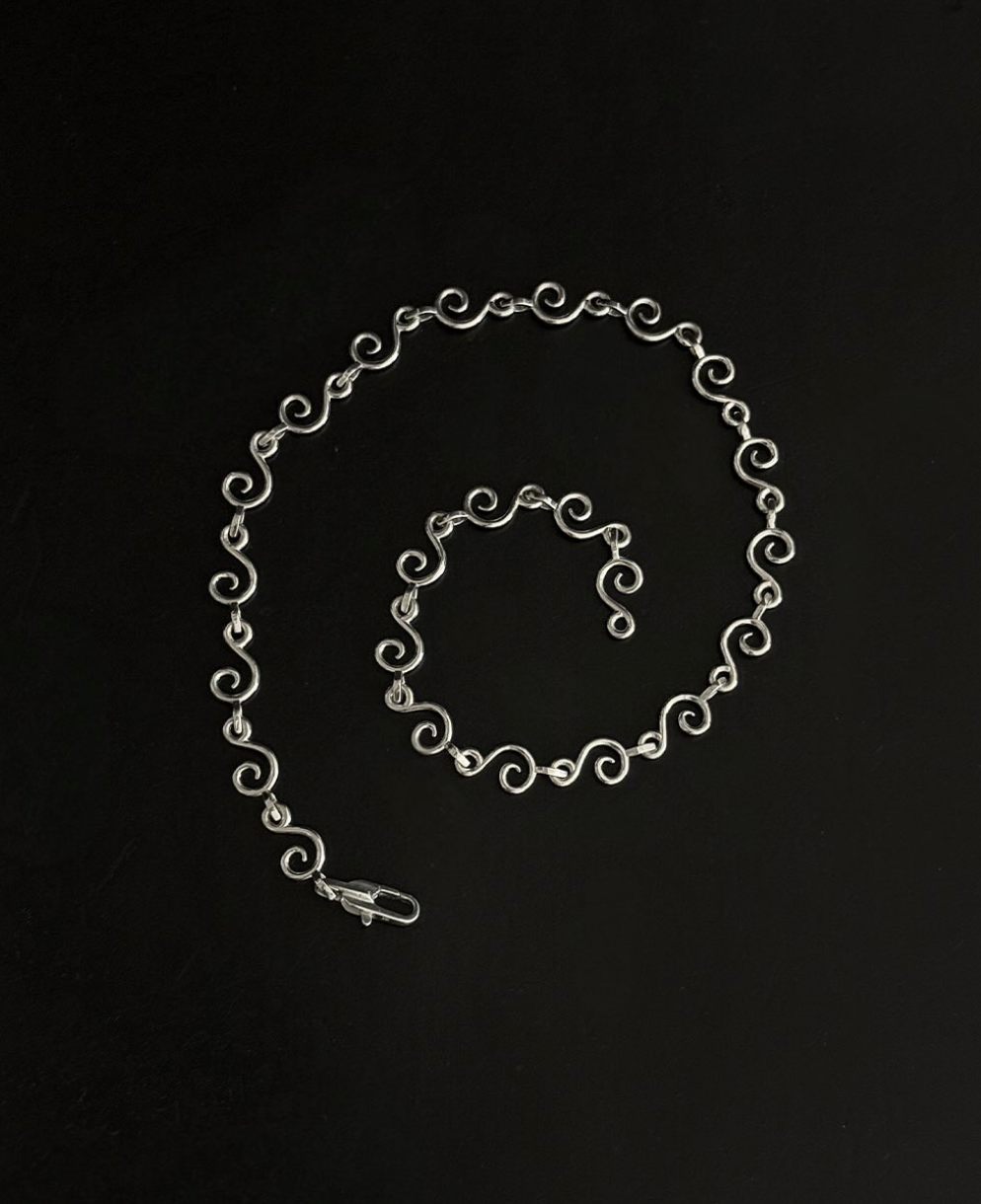 A sculptural necklace shaped by motion and memory. Its spiral form, part of the architectural series, draws from the quiet curves of nature and the structural language of architecture - a study in rhythm, return, and quiet structure. Handcrafted in 925 upcycled sterling silver.