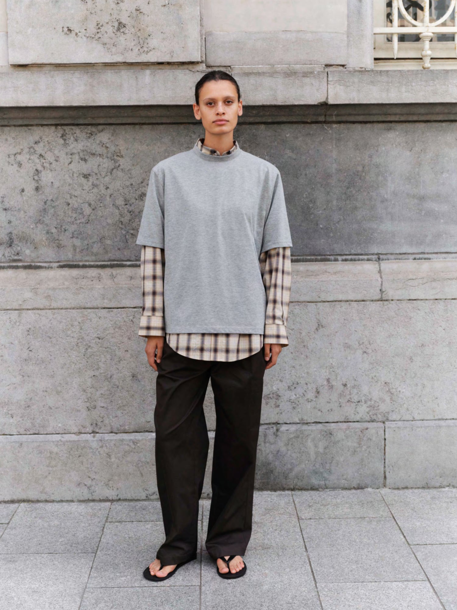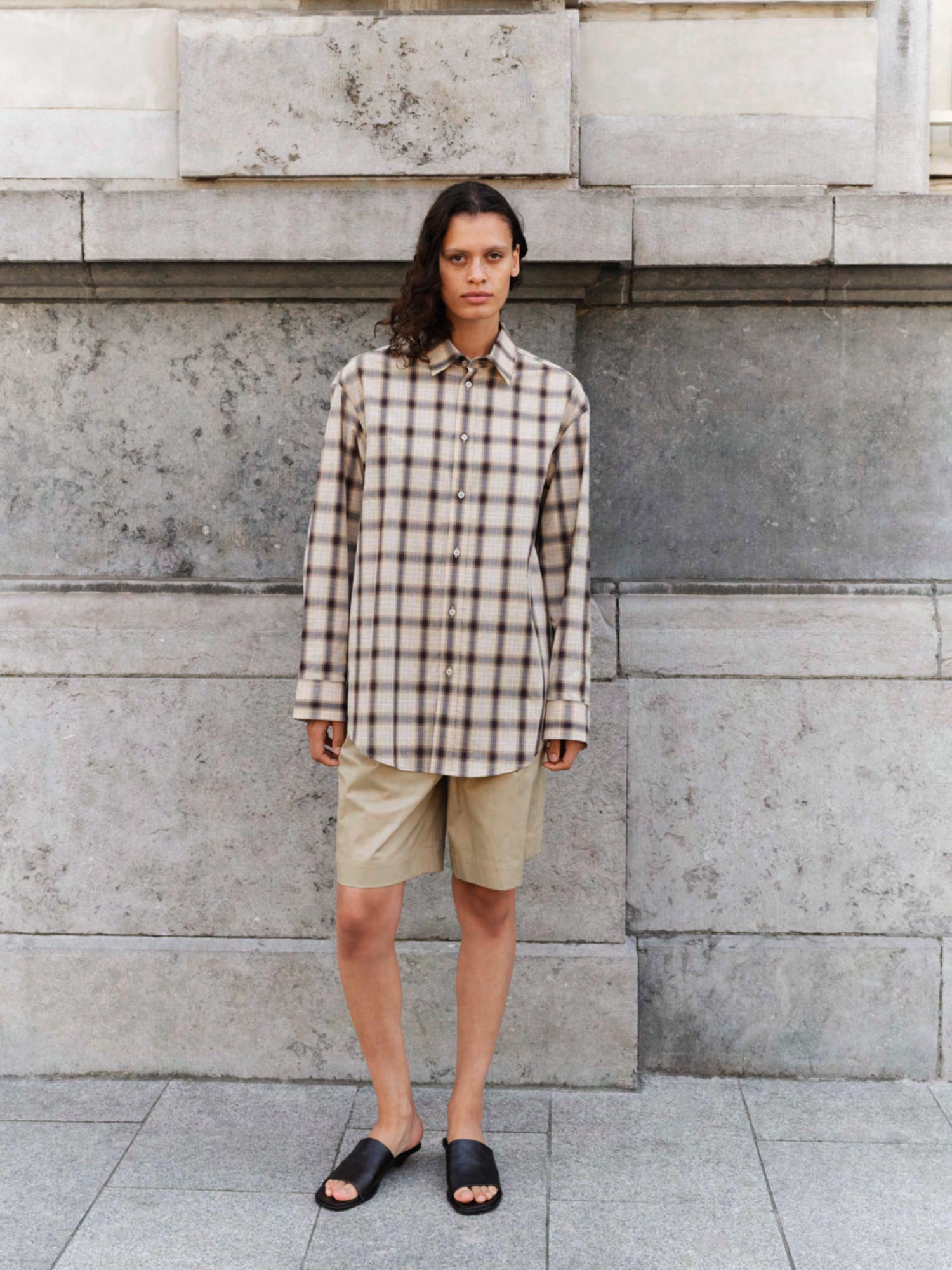 Dad’s Shirt in sand check is inspired by relaxed, borrowed proportions and classic menswear ease. Crafted from crisp cotton and finished with a softly curved hem.