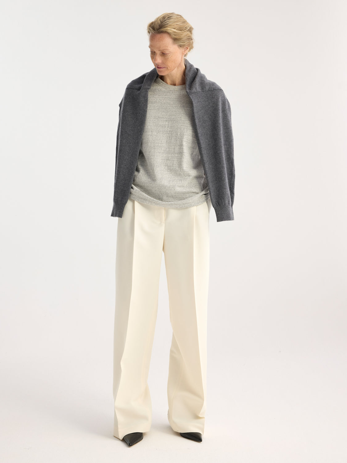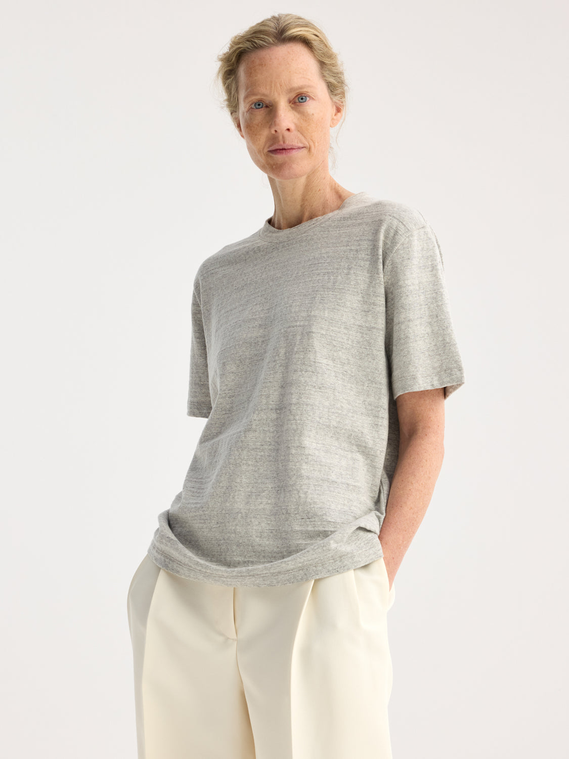 - Soft grey mouline, relaxed fit, crew neck, short sleeve