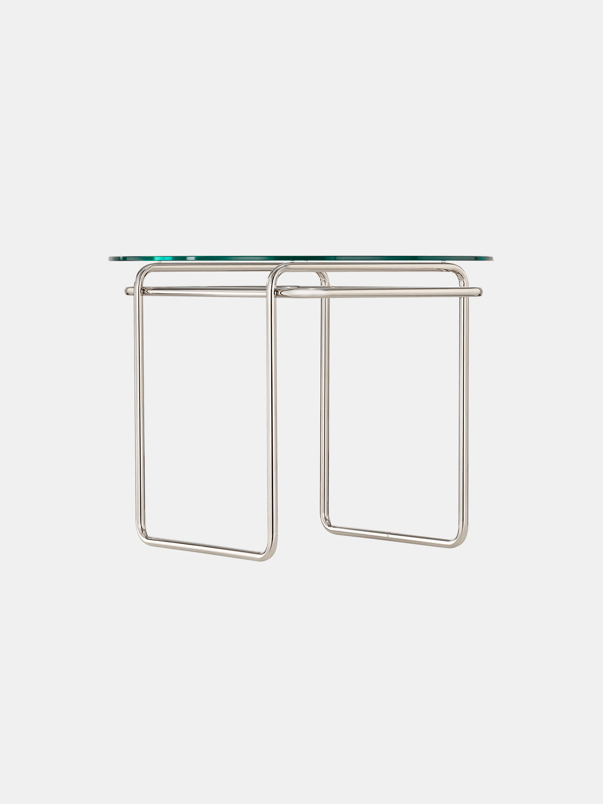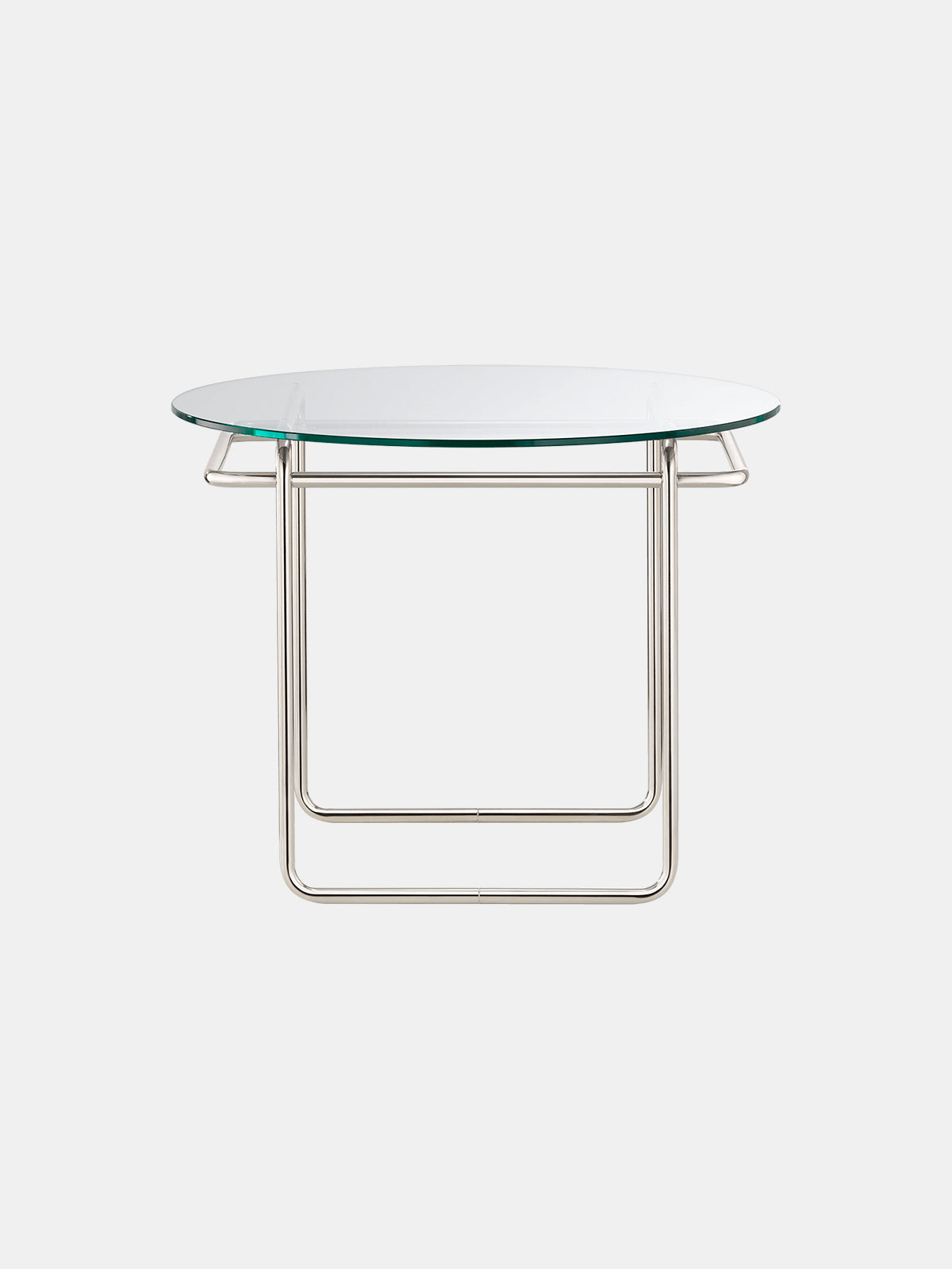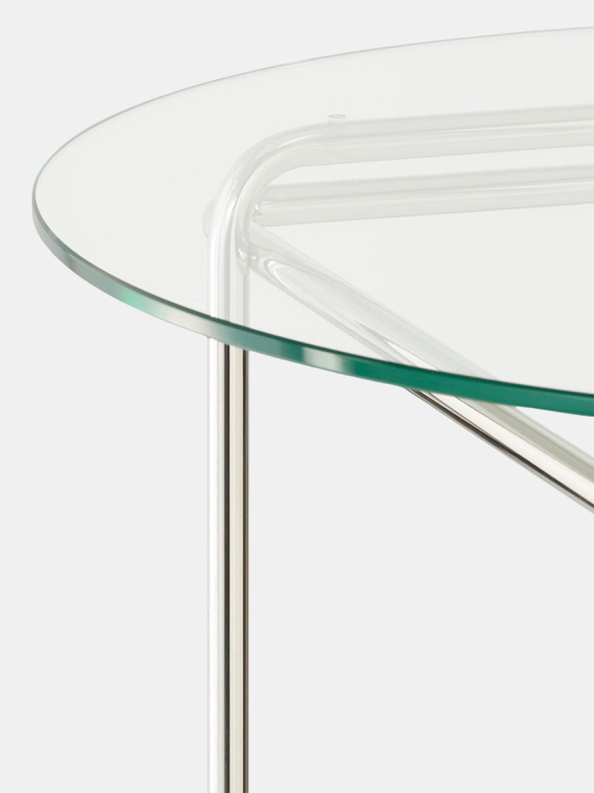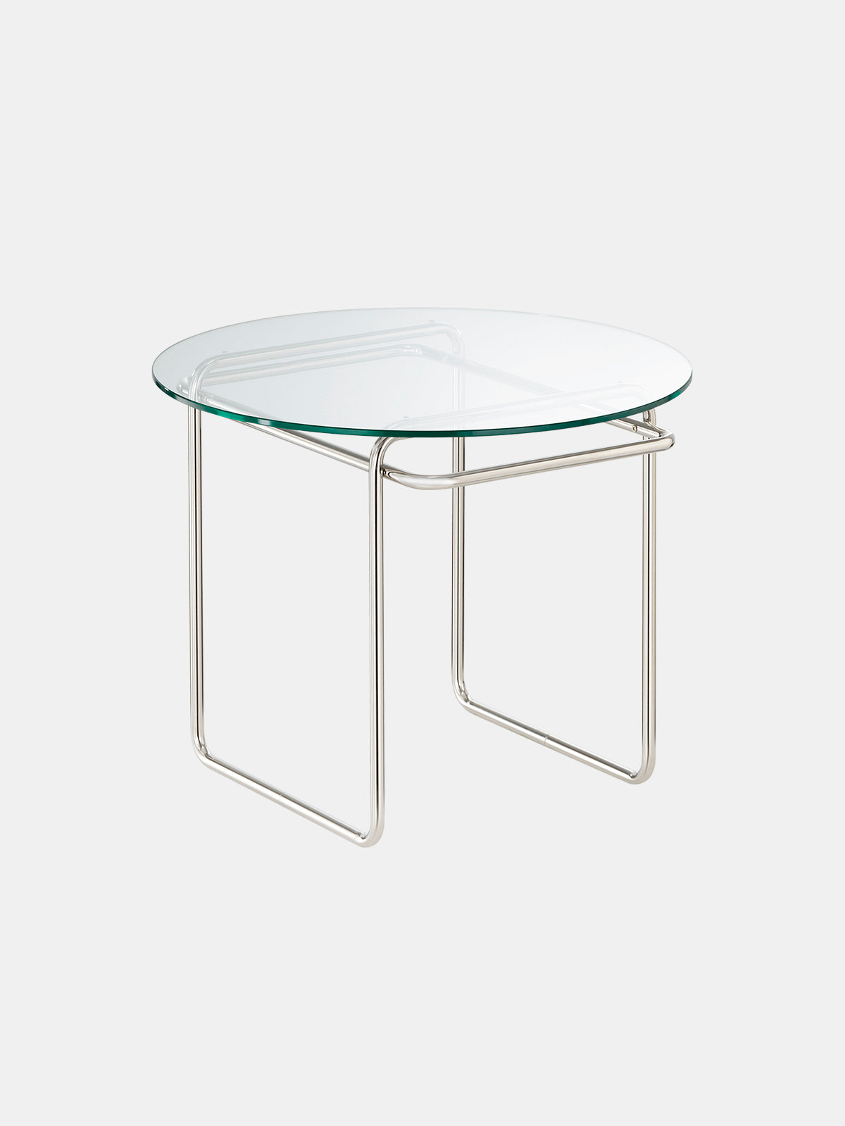 Marcel Breuer's K40 Table stands out as a significant Bauhaus classic. Designed in 1927 and now crafted by Tecta, it embodies the distinctive Bauhaus style characterized by its steel tube and crystal glass construction. This elegant piece features a round crystal glass tabletop supported by a gracefully curved frame made of chrome-plated steel tubing. The Tecta K40 brings elegance and functionality to any room with its simple yet refined design.