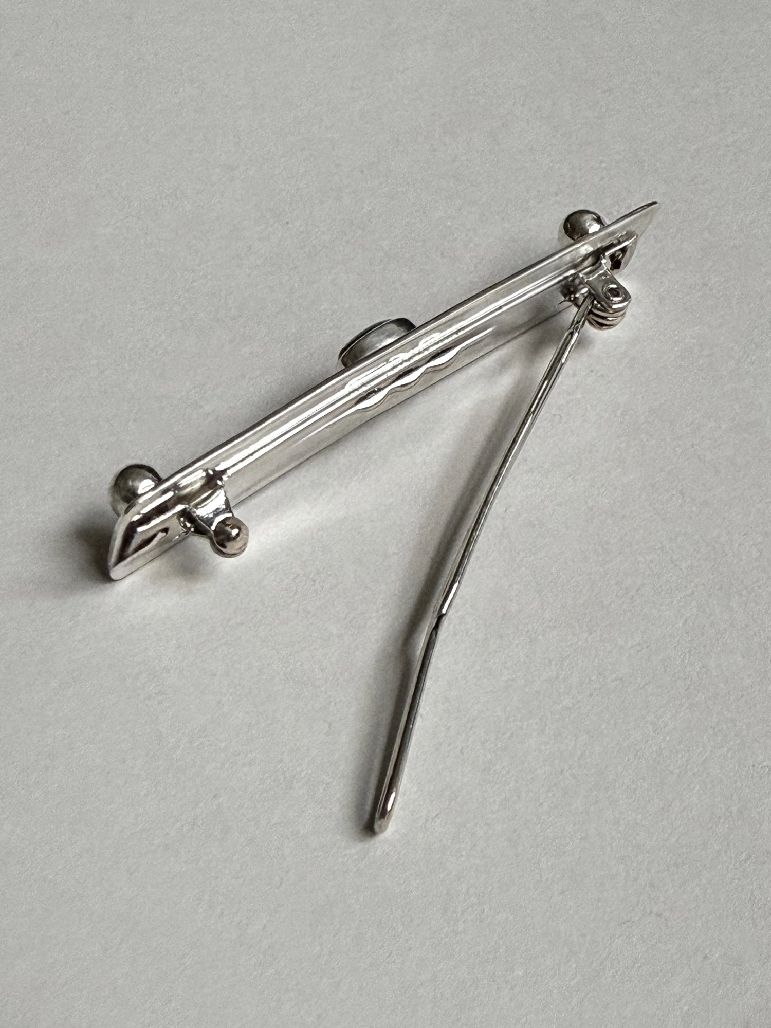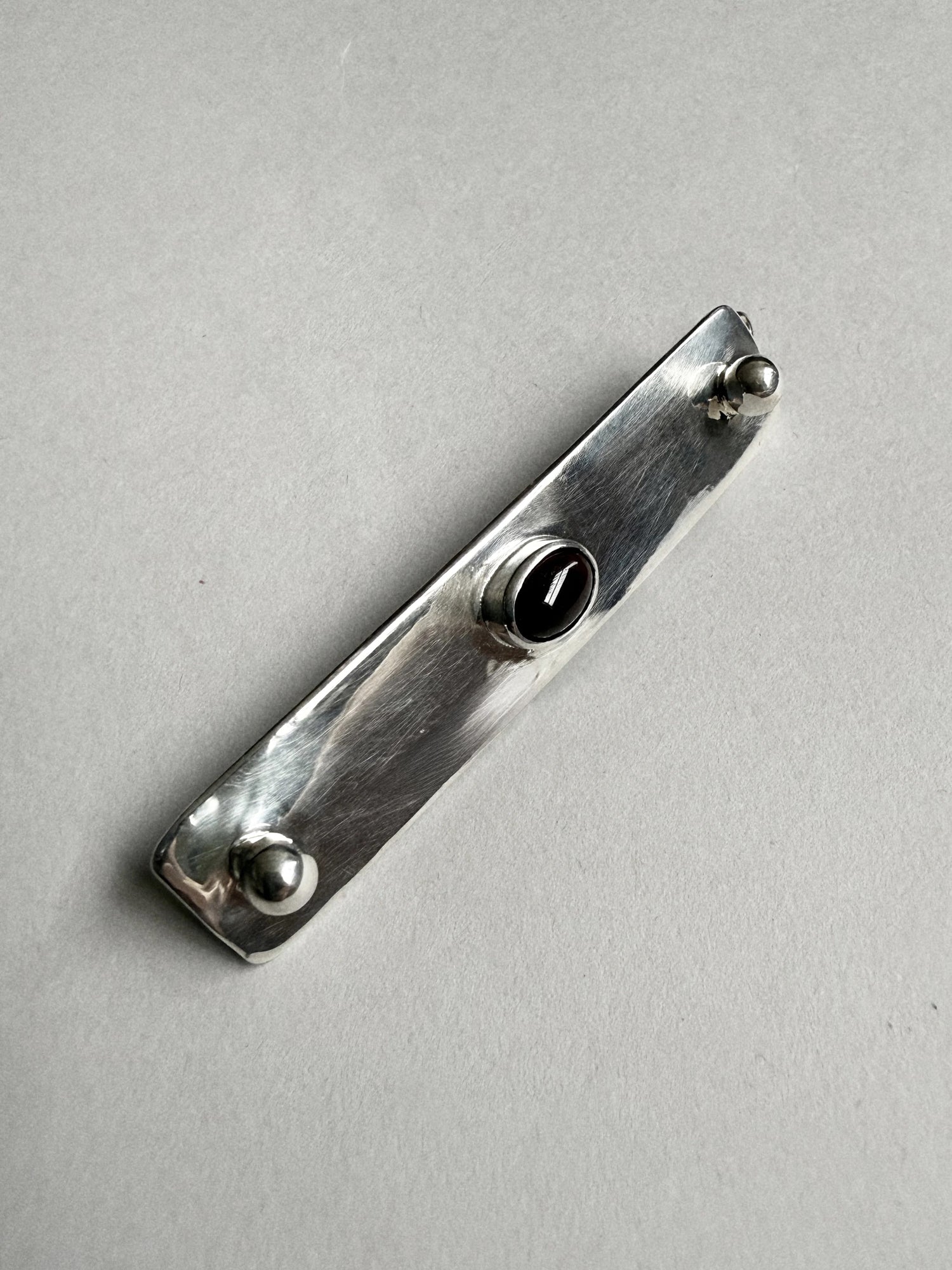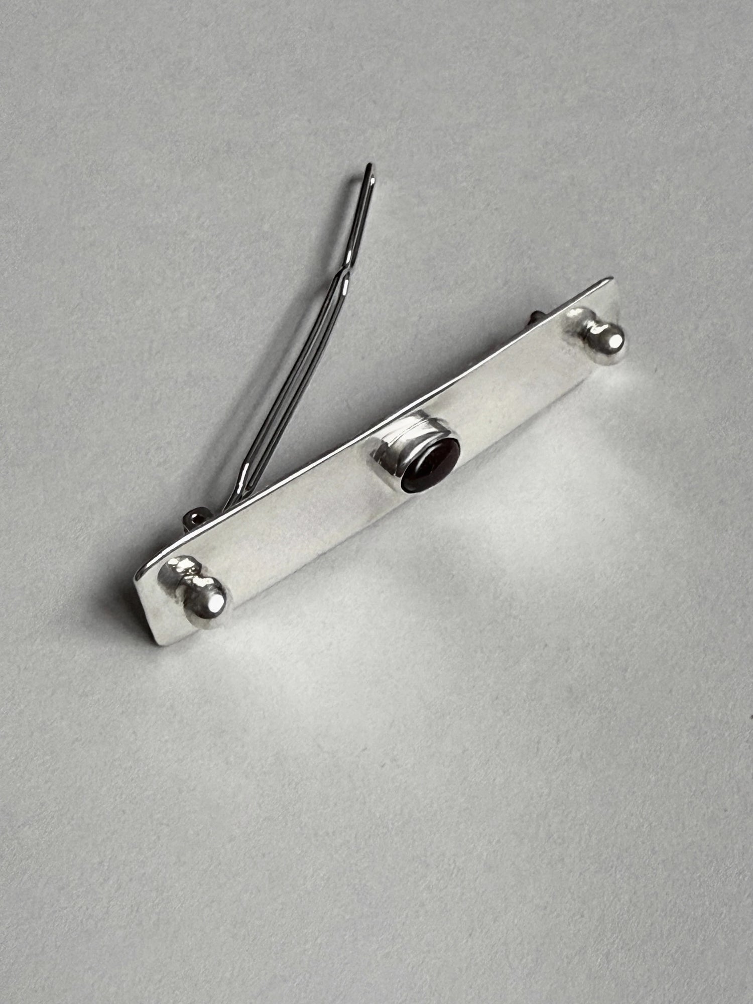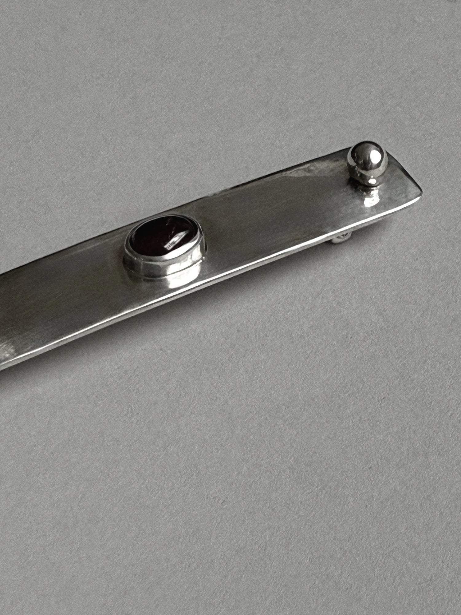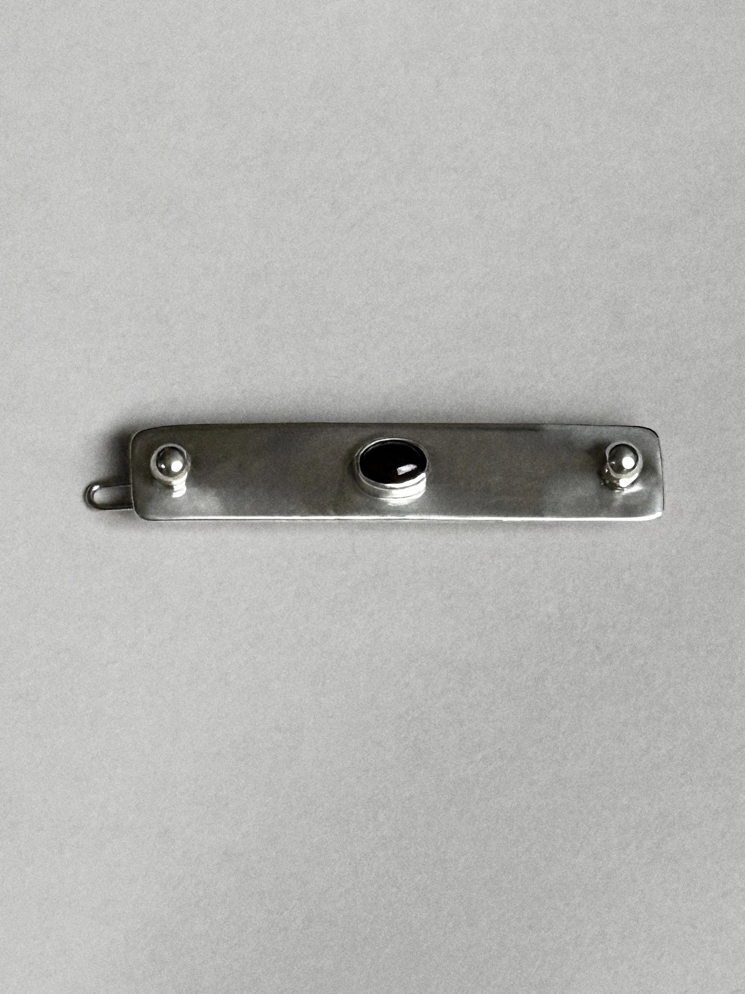 A sculptural barrette in recycled sterling silver, anchored by two polished spheres and a choice of stone - deep red garnet, black onyx, picture jasper, or lapis lazuli. A study in restraint and form, designed to secure the hair with a sense of weight and calm. Handmade to order in New York.