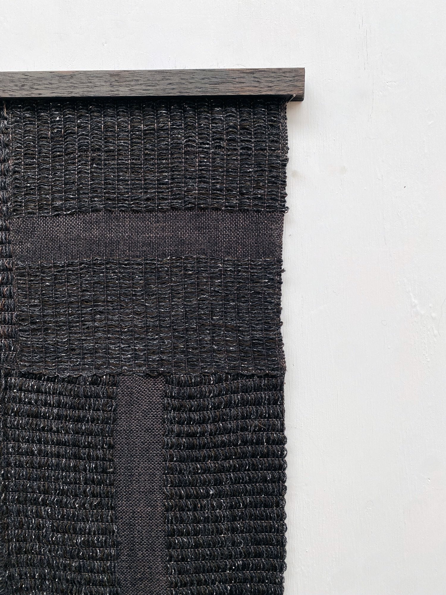 Captures the quiet elegance of twilight through a delicate balance of dark tones and soft textures. Handwoven with an intricate technique, this piece reflects a subtle, contemplative beauty that brings a sense of calm and depth to any space. The interplay of light and shadow across its fibers evokes the stillness of night, creating an artful and grounding presence on your wall. Installation: Designed to rest with its frame on nails in the wall.
