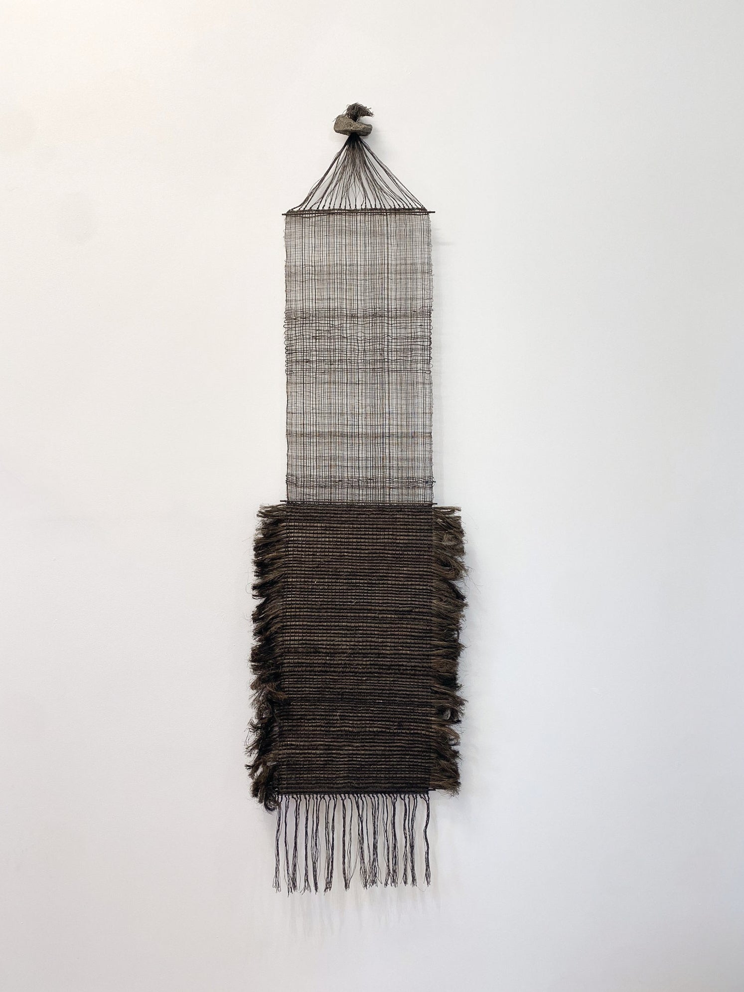 Open Tracks explores the interplay of contrasting materials, linking the soft, tactile nature of cloth with the enduring strength of stone and ceramic. Inspired by ancient weaving techniques where rocks and weights kept the warp under tension, this piece pays homage to the long history of weaving, grounding it in both tradition and modern design. Installation: Hang this piece on a screw in the wall.