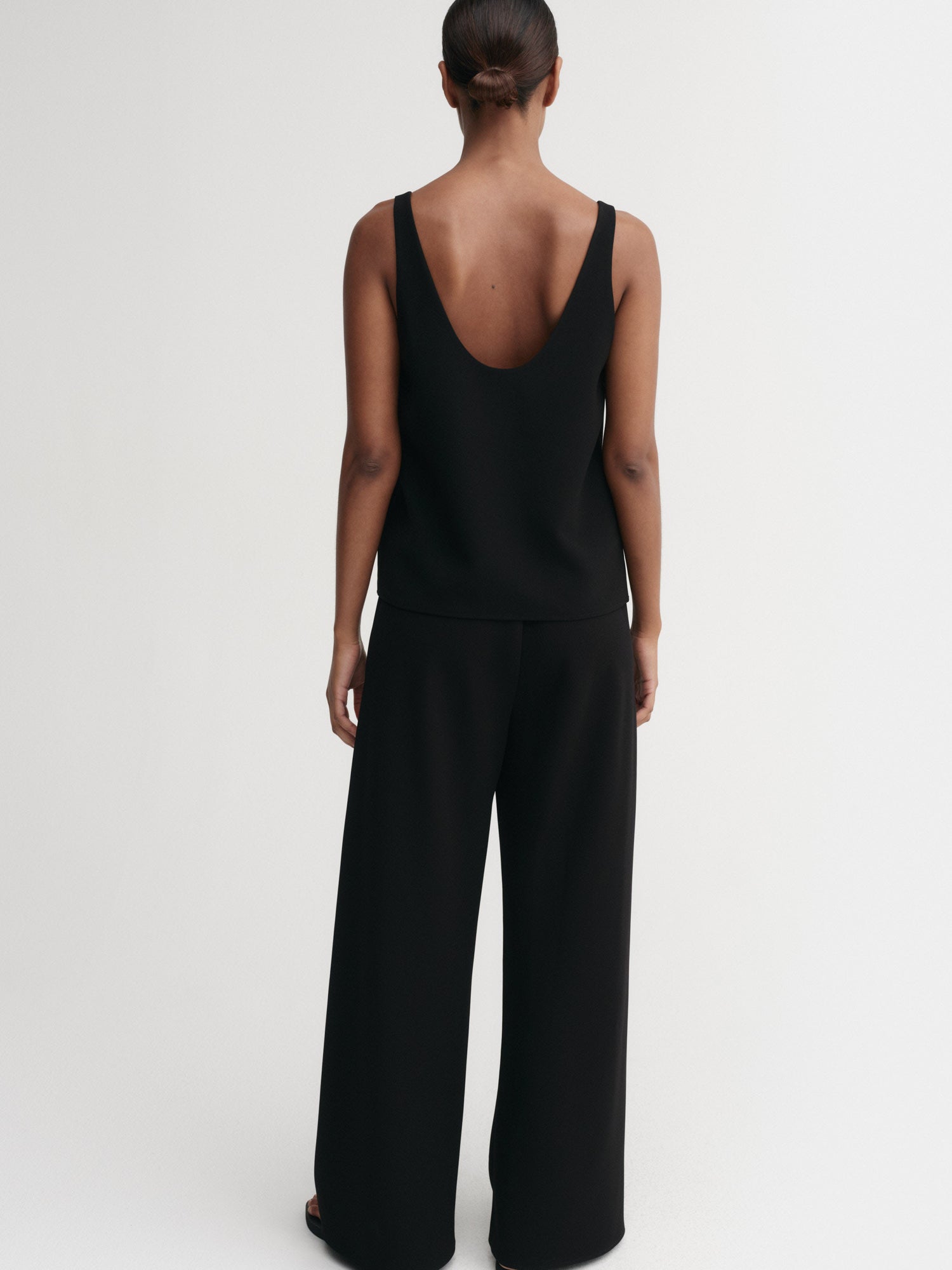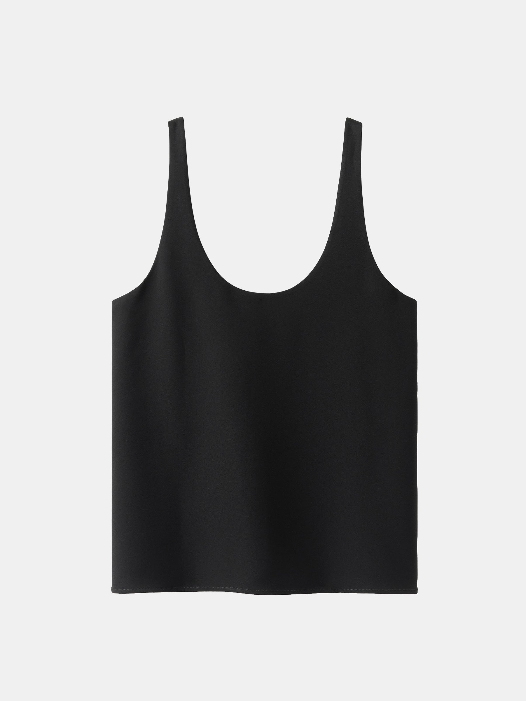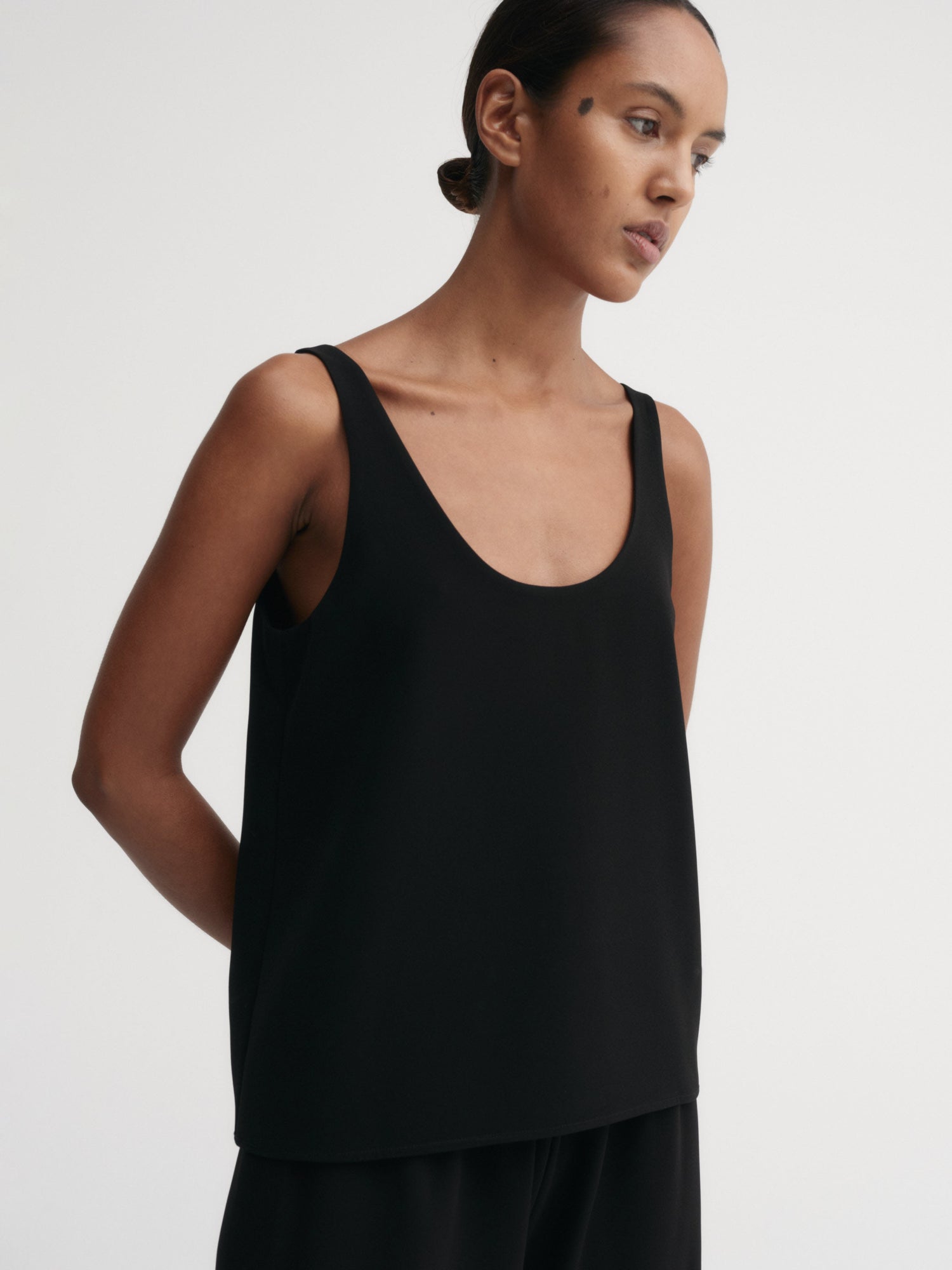 Romy Crepe Top is crafted from a refined crepe blend with a smooth, fluid drape. Cut to a relaxed silhouette with a scooped neckline and back, and generous armholes that enhance the open shape.