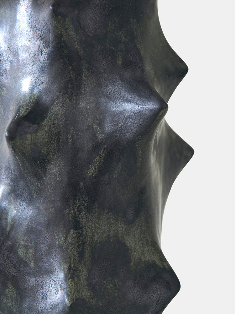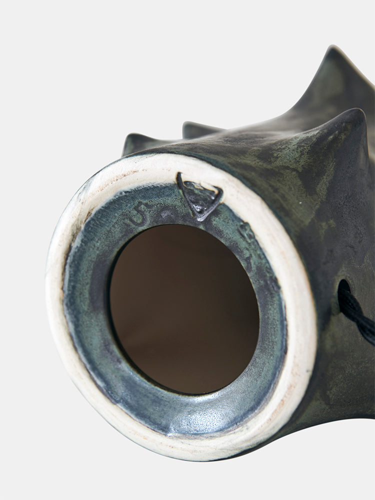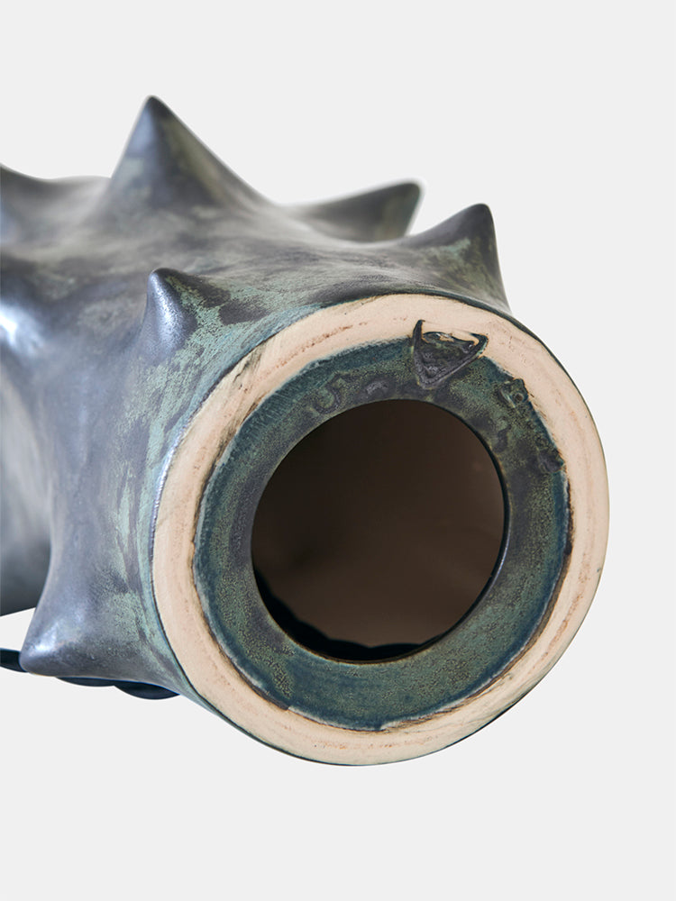 The Rosethorn table lamp is a renowned example of Mid-Century Danish design, featuring an abstract biomorphic form adorned with thorn-like projections asymmetrically arranged around its sides. It was designed by the Danish ceramicist Knud Basse and produced by Michael Andersen & Son in Denmark. The lamp is decorated with a unique mottled dark green and bluish-colored glaze, while the handmade off-white chintz fabric lampshade adds to its distinctive aesthetic. Additionally, the lamp comes with a loose top cover that creates a cozy lighting ambiance. The lamp is signed with an impressed manufacturer's mark located underneath its base.
