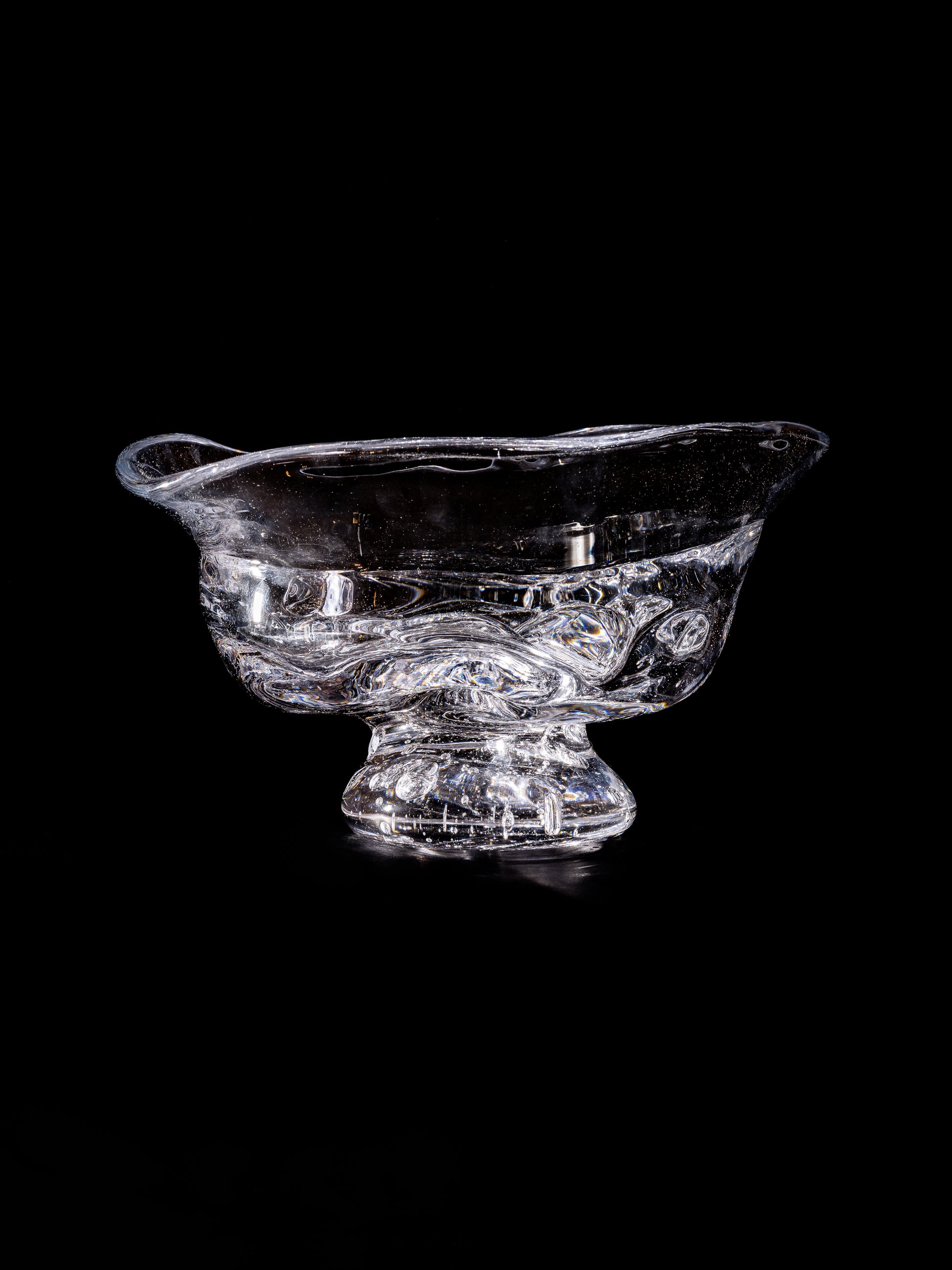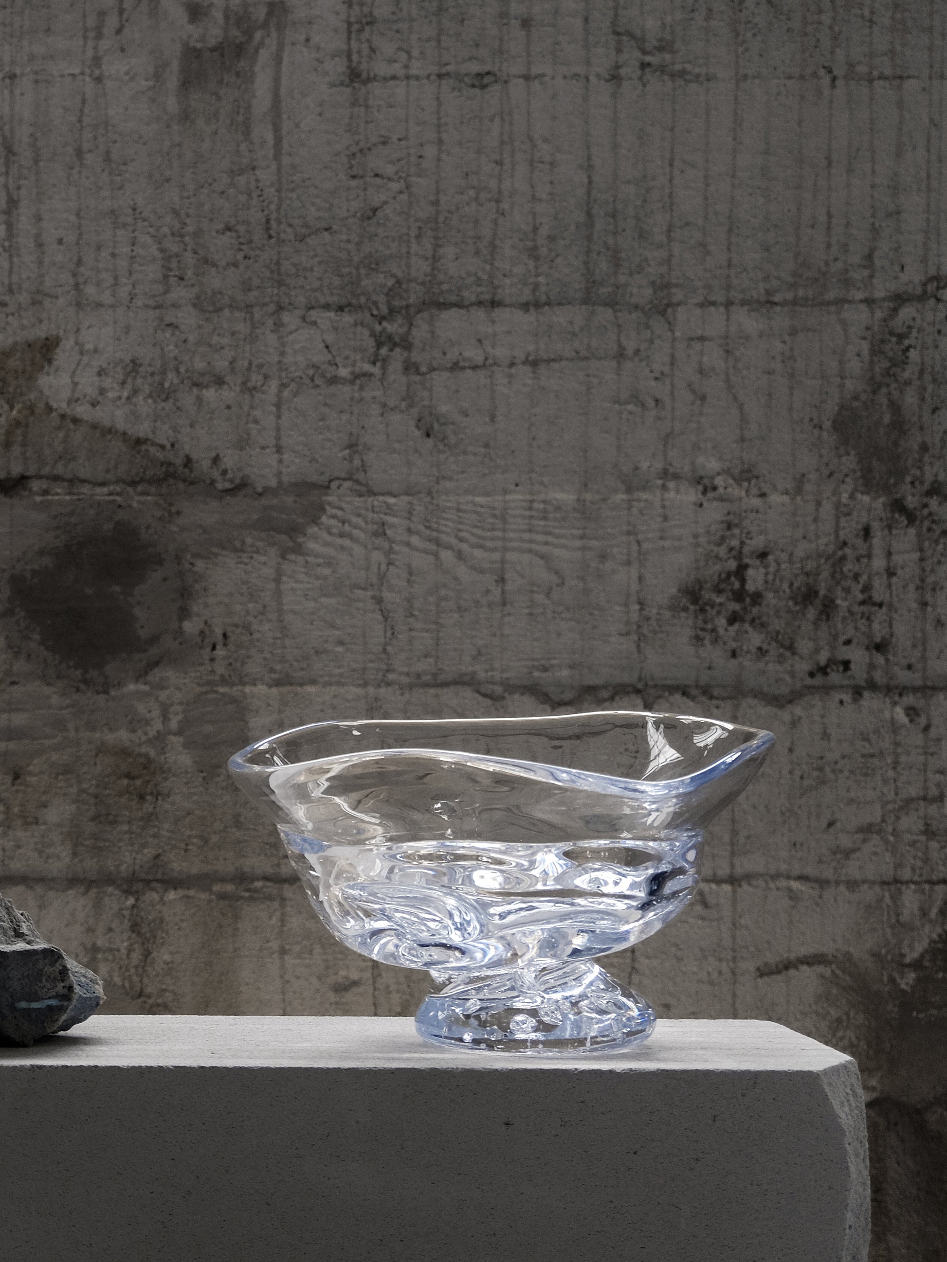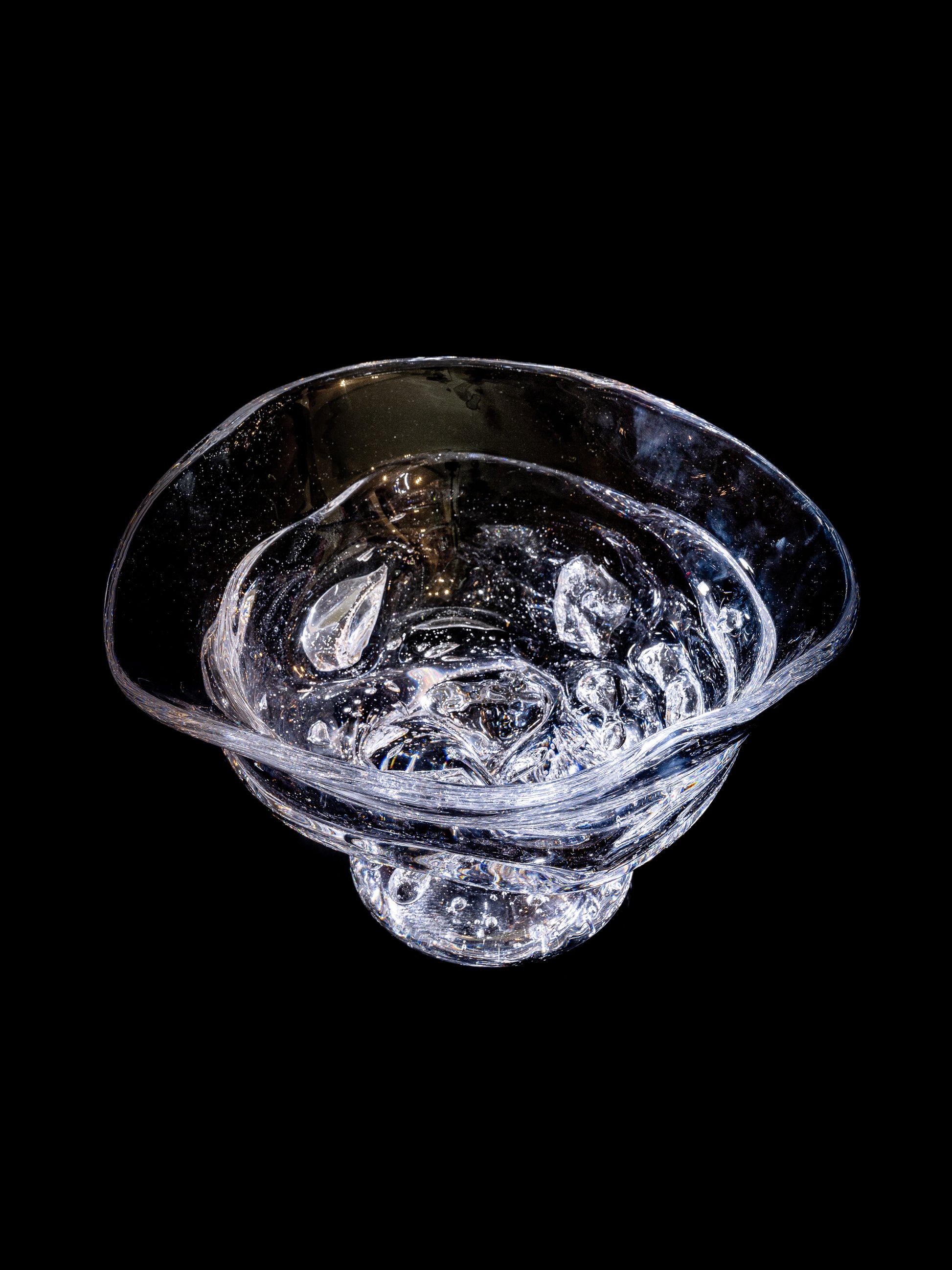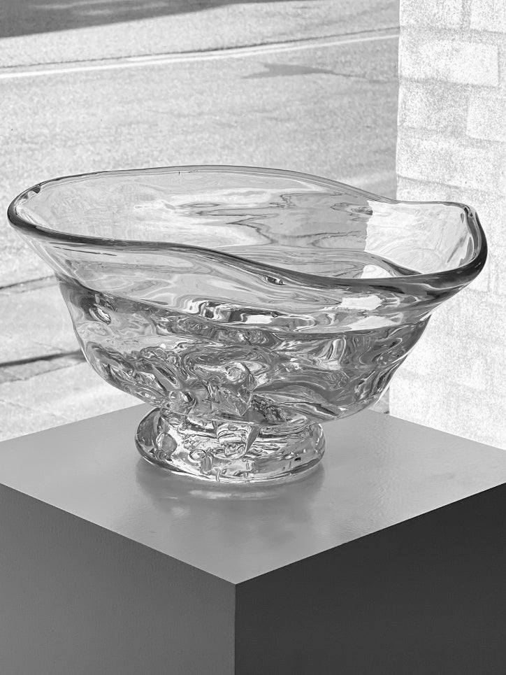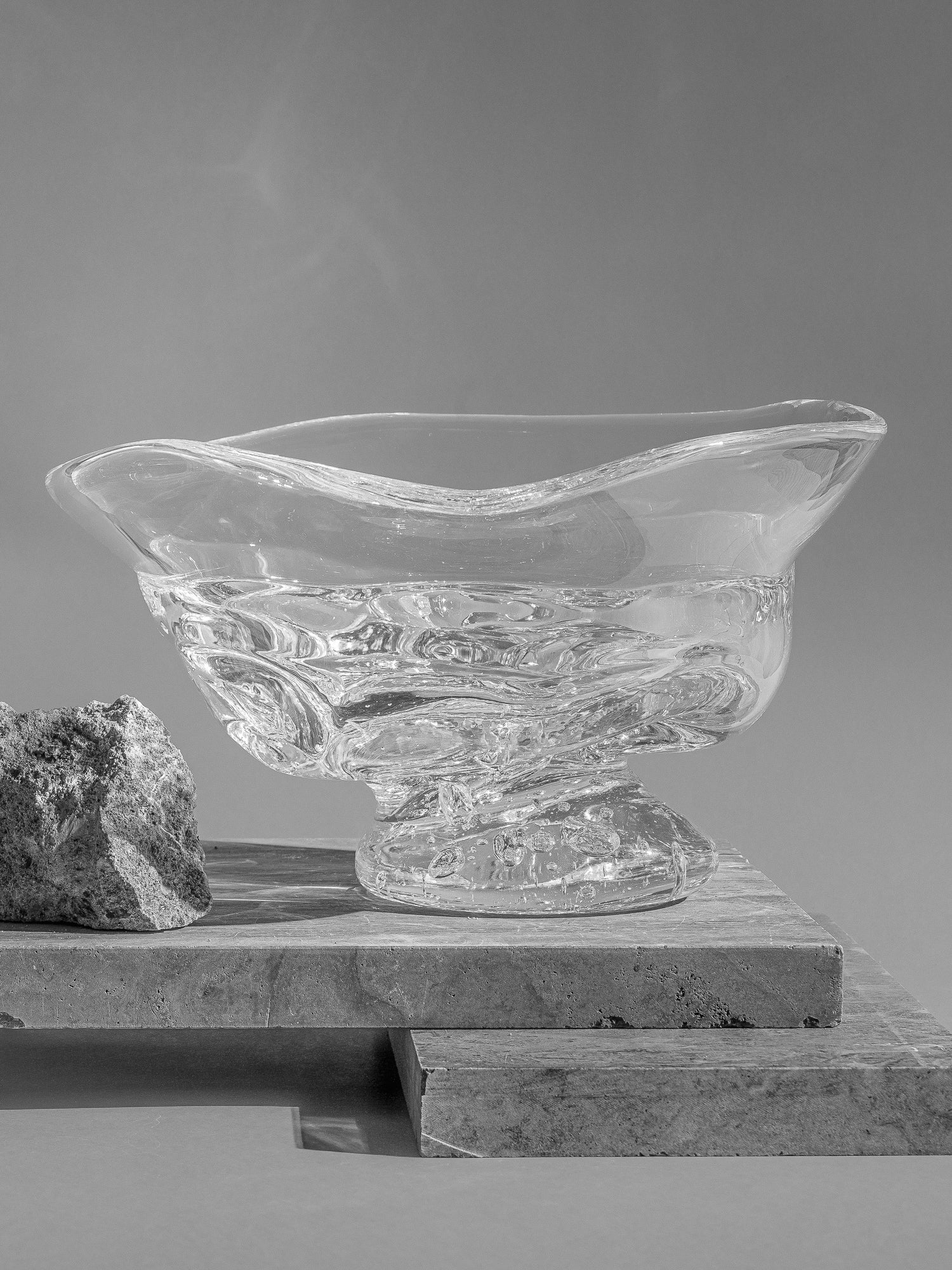 Introducing the glass bowl from Szklo Studio - a statement piece that will stand out like a sculpture on your dining table or kitchen countertop. Its overscale size makes it perfect for holding lemons, avocados, or other pieces. Meticulously crafted using glass-blowing techniques, this glass is designed to last. Its sculptural and brutalist style showcases an irregular shape and abstract texture.