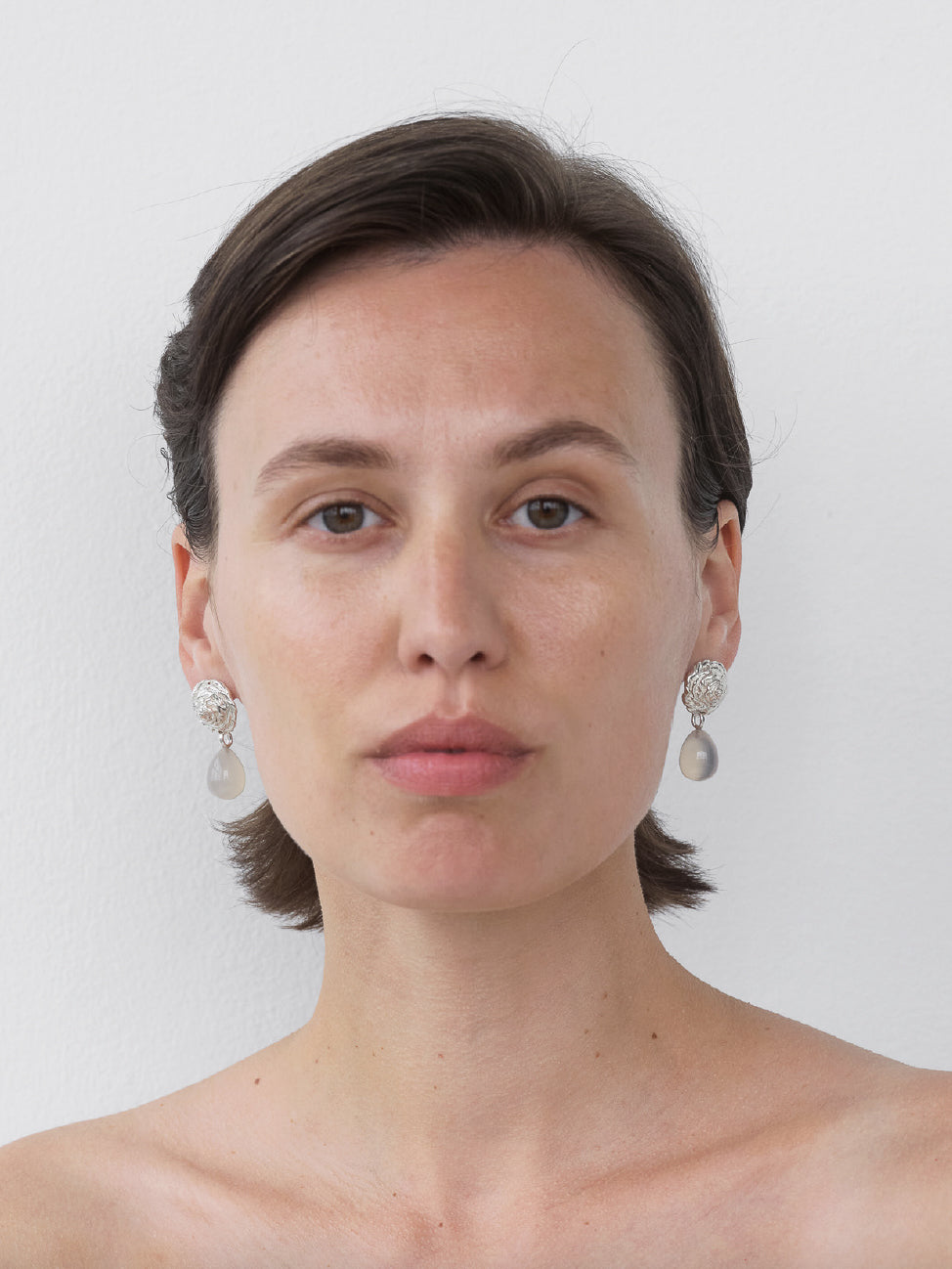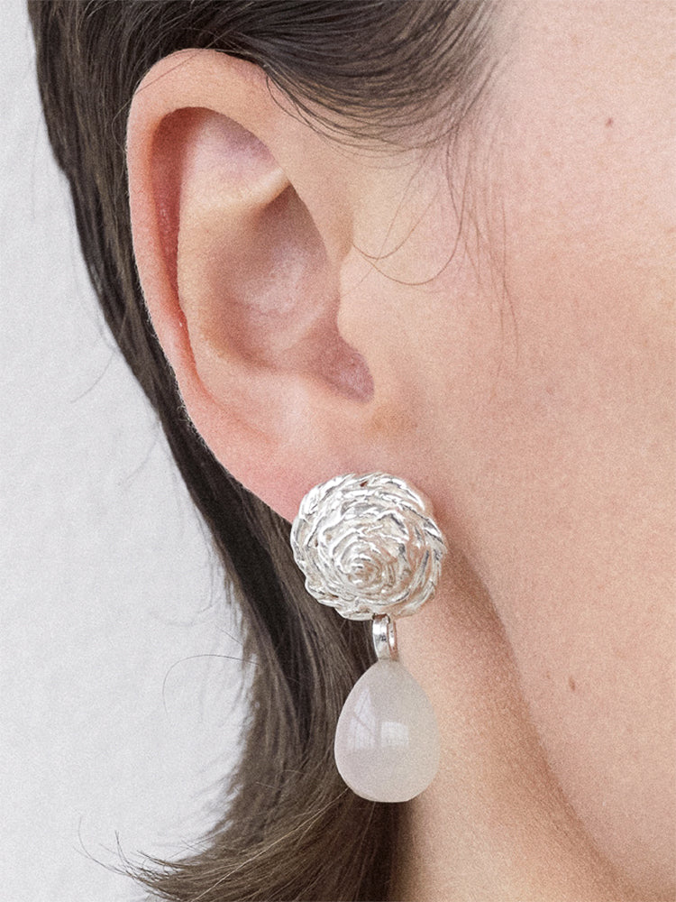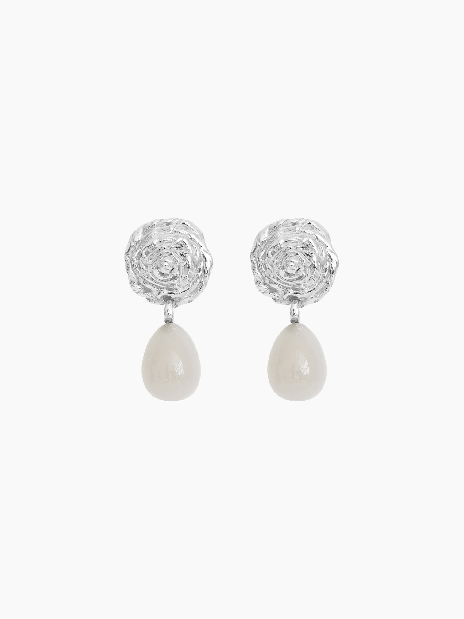 Håndlavede øreringe i sterlingsølv med mælkehvide agat-sten og teksturerede detaljer. Disse øreringe er en del af La Famiglia-kollektionen, lanceret til efterår/vinter 2024.