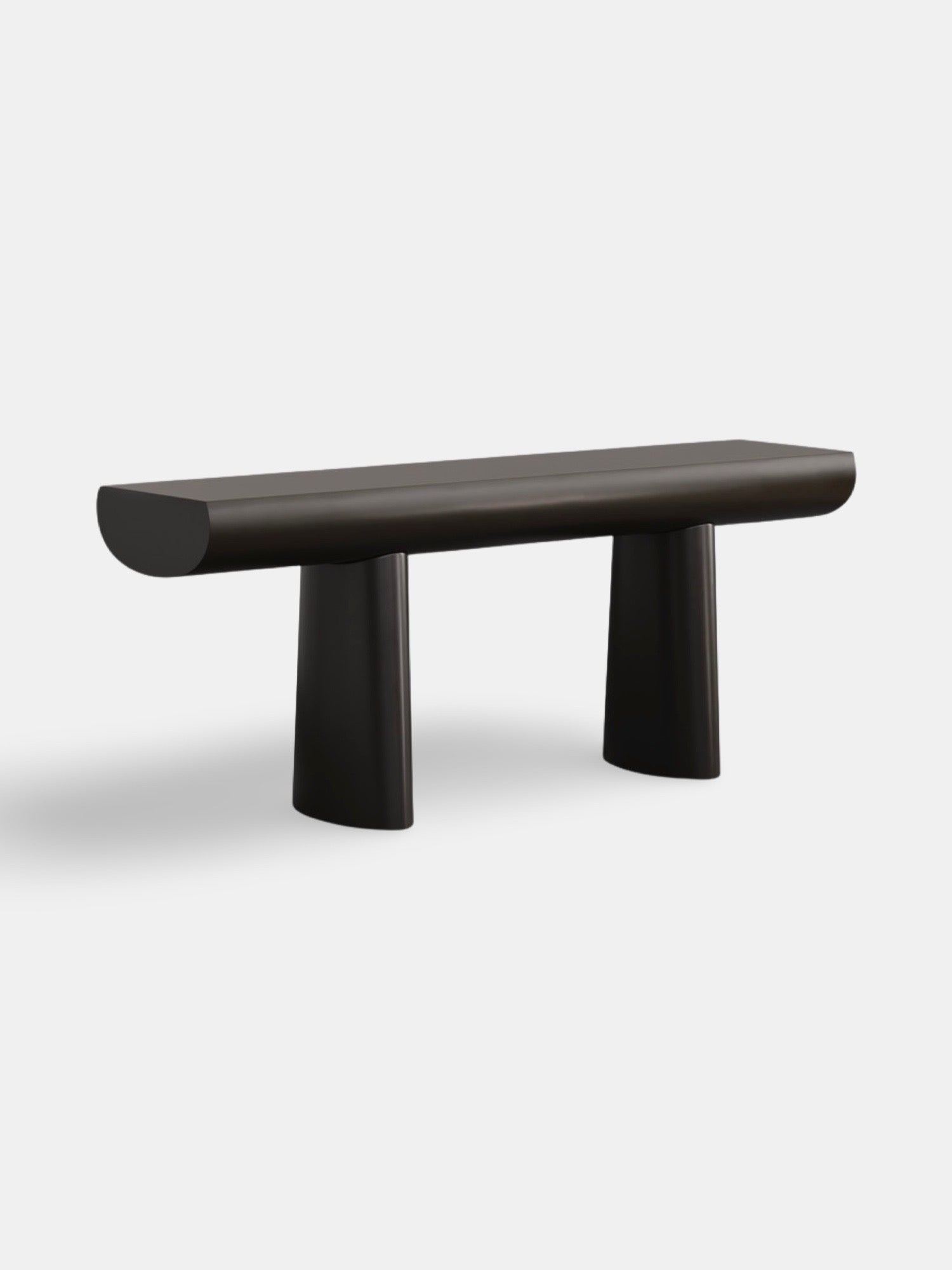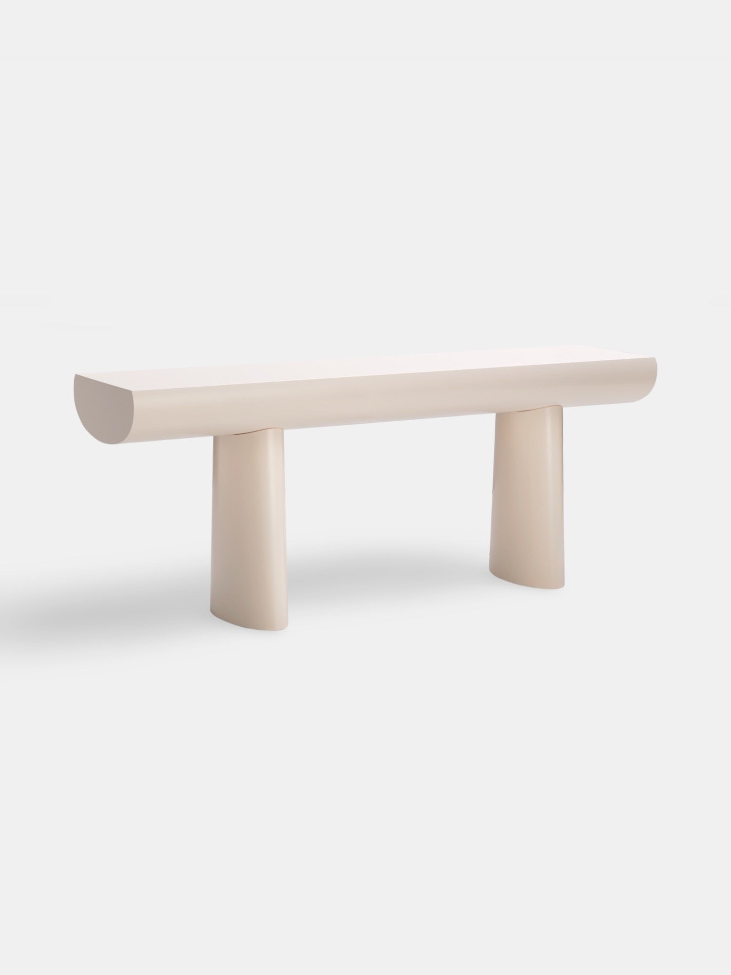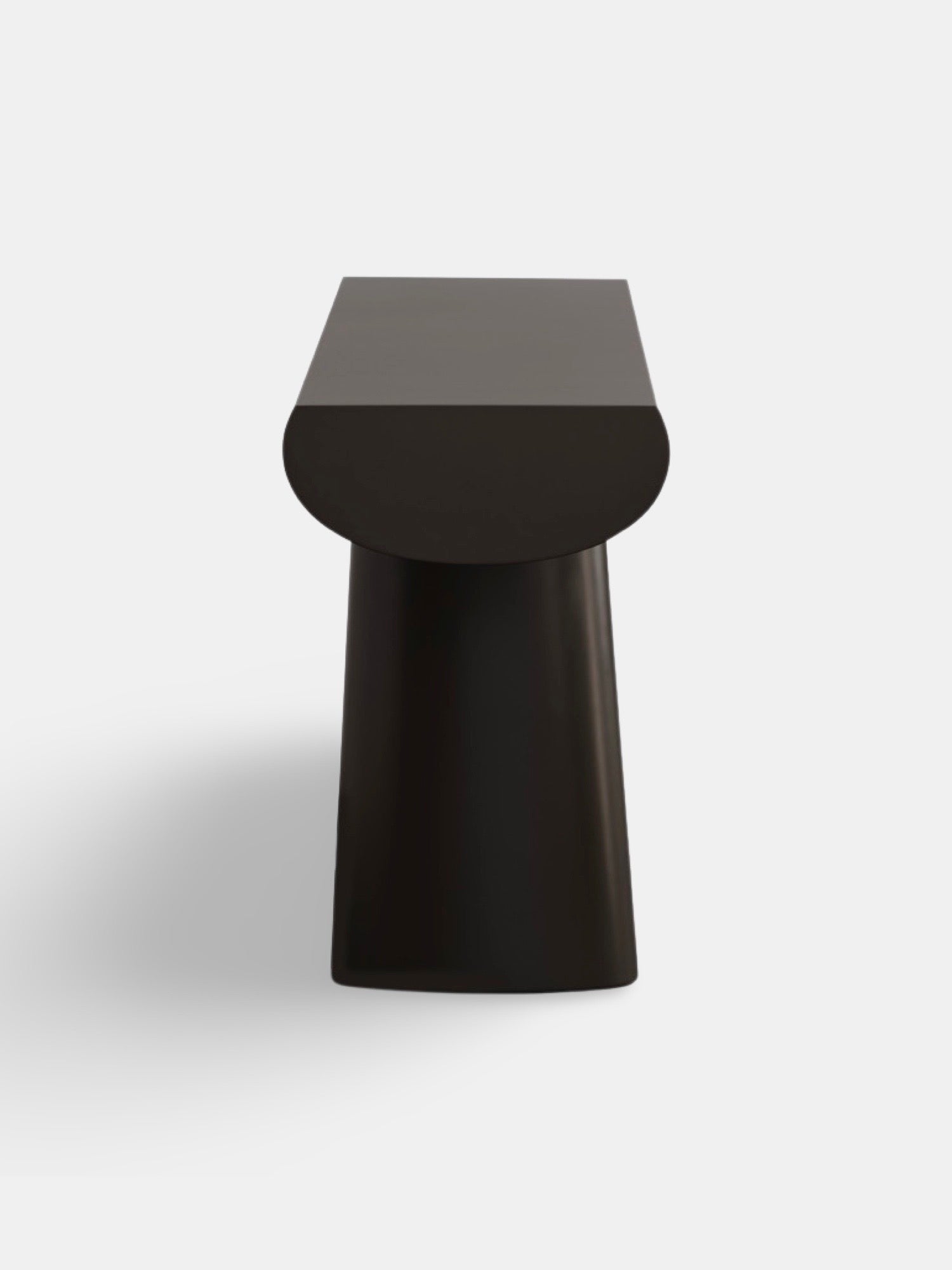 Bordets ben fortsætter sømløst fra den linje, som bordpladen danner, hvilket skaber en harmonisk visuel enhed. Bordpladen og benenes baser har samme bredde, hvilket understreger deres lige betydning i det samlede design. Desuden tilbyder den justerbare afstand mellem benene en personlig tilpasning, der fremhæver den skulpturelle appel af dette enestående møbel.