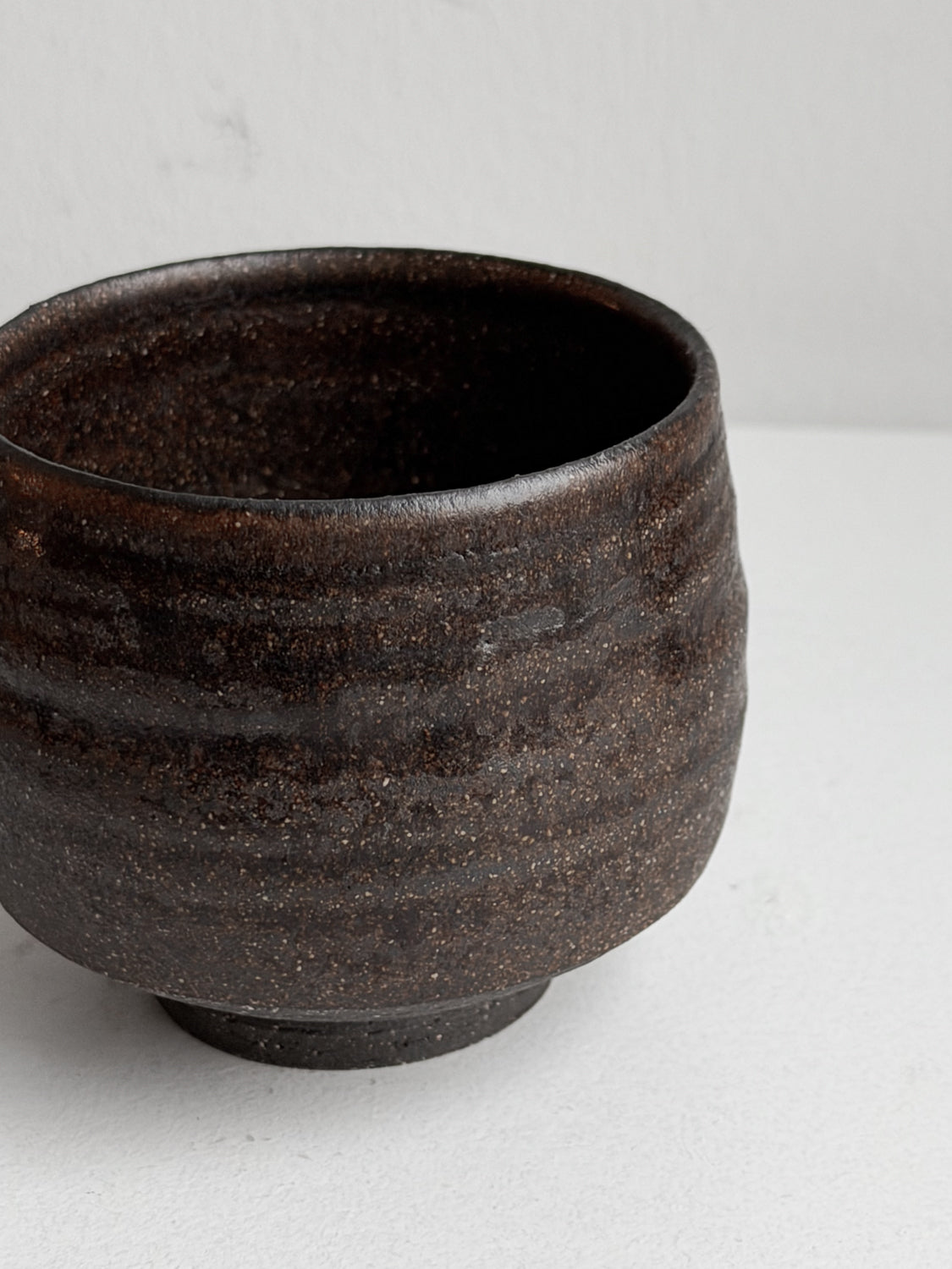Kristine Vedel Adeltoft, en keramiker fra Falster, Danmark, skabte en hånddrejet kop med hank af groft, sort stentøj. Koppen er færdigbehandlet med en transparent, silkemat glasur. Koppen har en afrundet bund, der giver et behageligt greb.