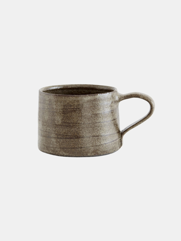 Kristine Vedel Adeltoft, en keramikkunstner fra Falster, har håndlavet denne kop med hank i groft, sort stentøj. Den har en Grønsund-glasur, der giver koppen en næsten farveløs overflade, som fremhæver strukturerne fra leret og drejningsprocessen. Med en afrundet bund giver koppen et behageligt greb.