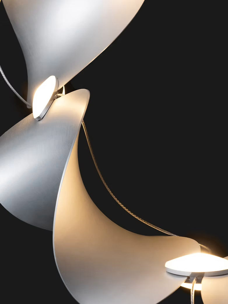 Hver skærm er presset i aluminium af høj kvalitet, satinpoleret og derefter anodiseret eller spejlpoleret. Placeret side om side danner de bløde kurver og matte overflader et levende landskab i rummet.