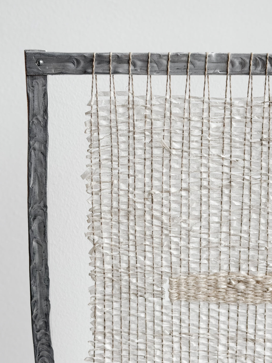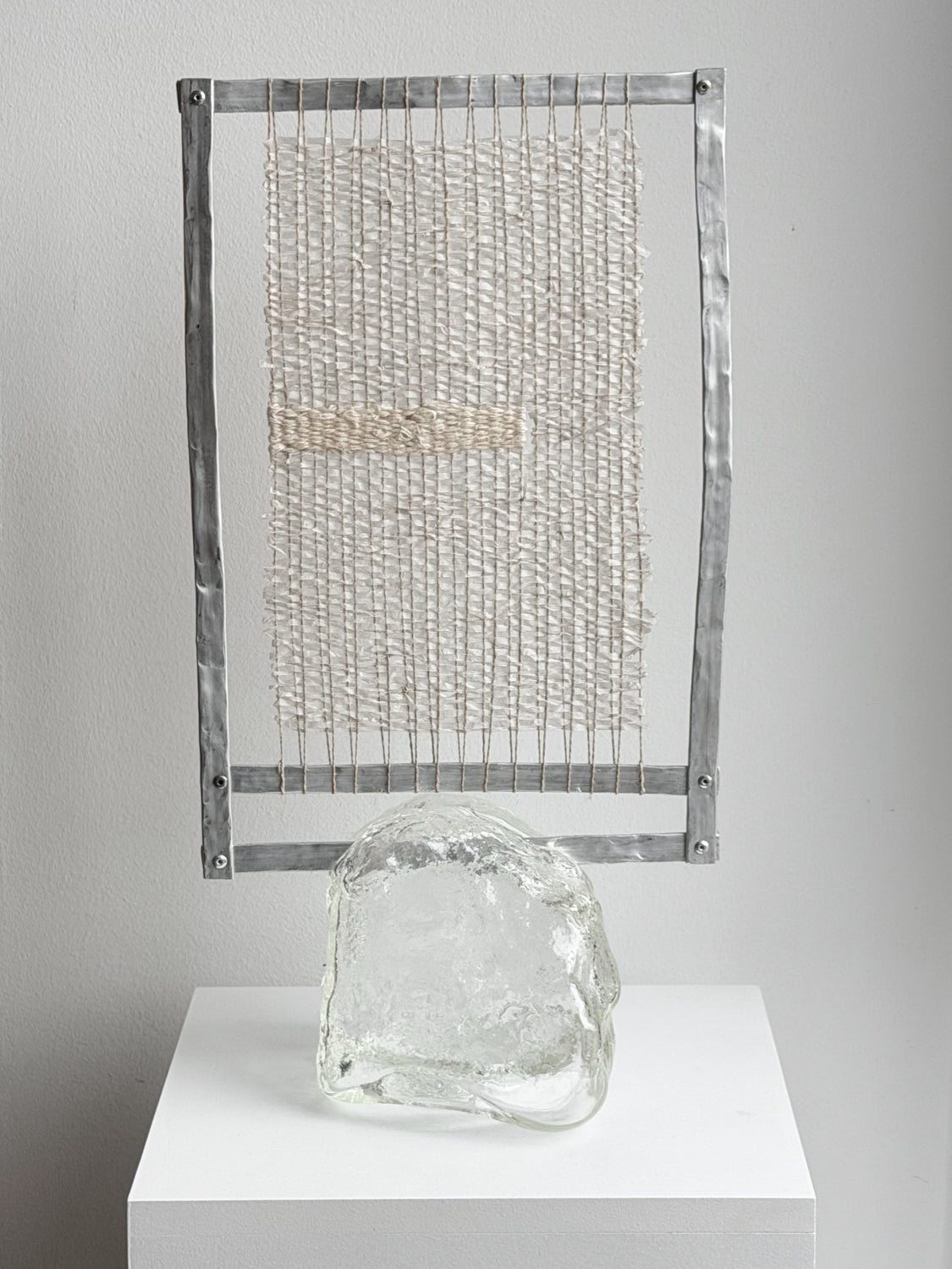 Ether I er et poetisk møde mellem tekstil og glas – vægtløst og forankret på én og samme tid. Et håndvævet panel i hør og bomuld svæver i en ramme af hamret metal, hvor tekstilets blødhed holdes i spænd af glassets flydende tyngde. Værket er skabt i samarbejde med Studio Dokola og balancerer mellem nærvær og forgængelighed.