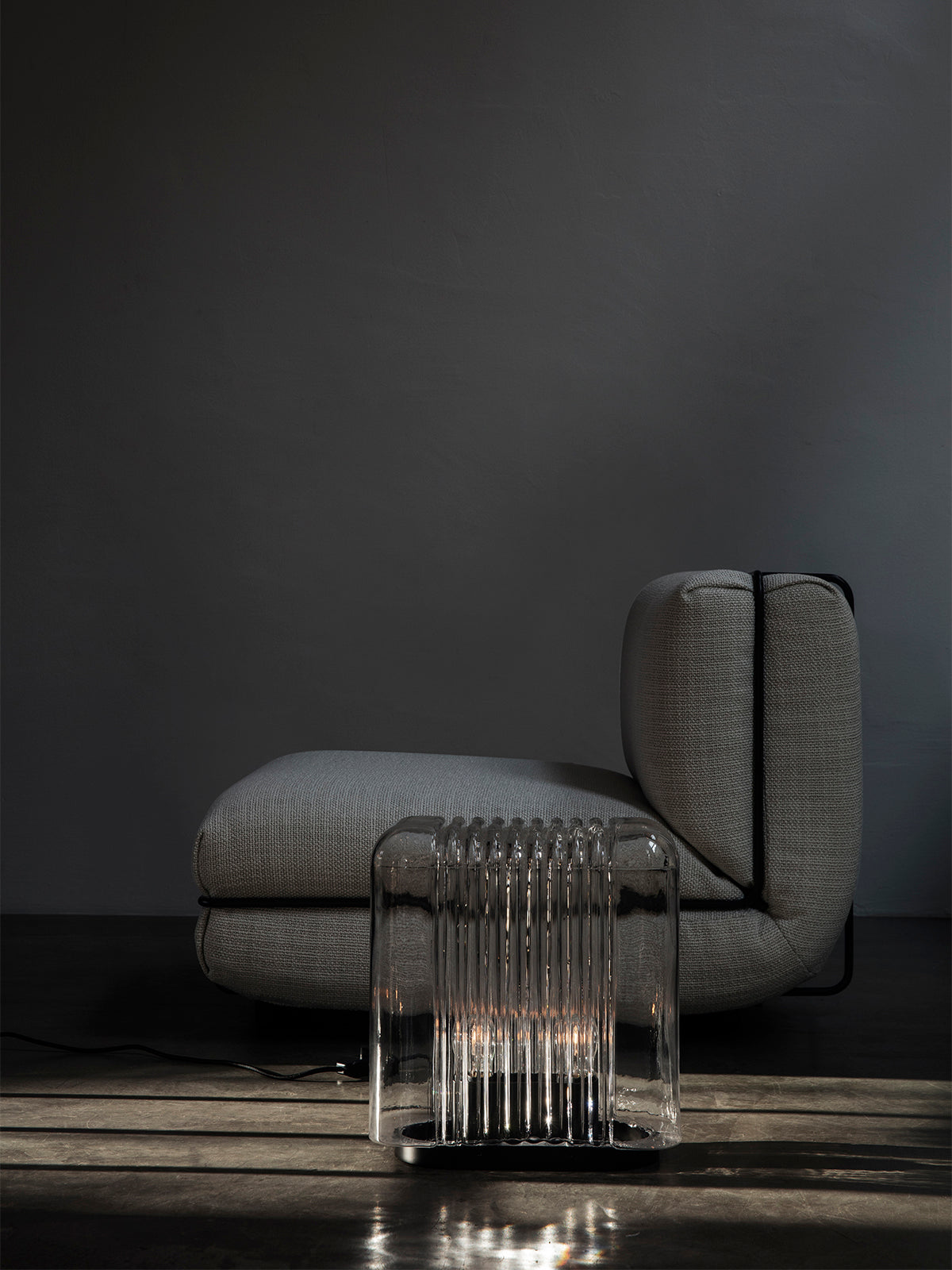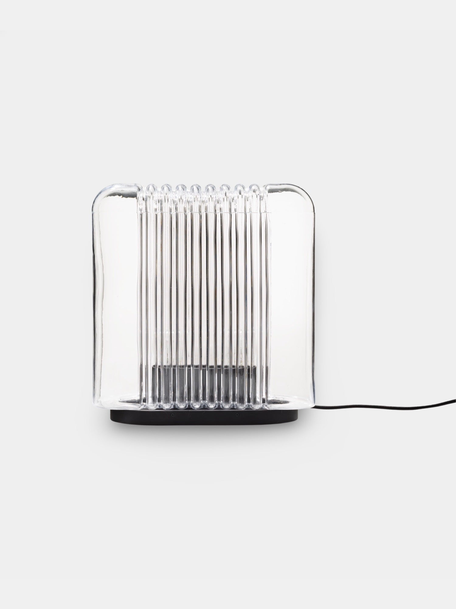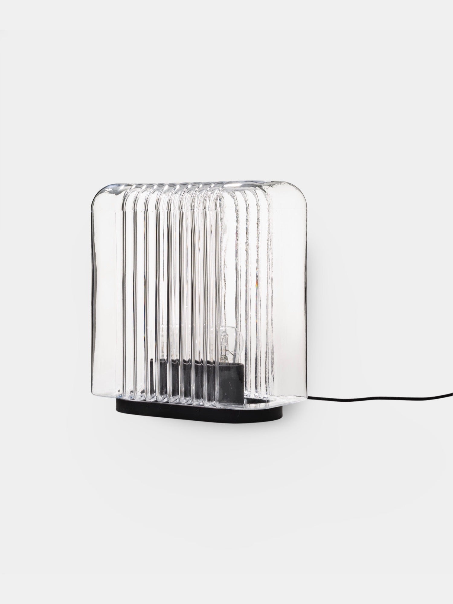 Lari Lampen, der er mundblæst som en enkelt, sammenhængende enhed, holdes sammen af sin base, som også rummer det elektriske system. Designet afspejler subtilt elementer fra Angelo Mangiarottis tidligere arkitektoniske værker, dog i en mindre skala.