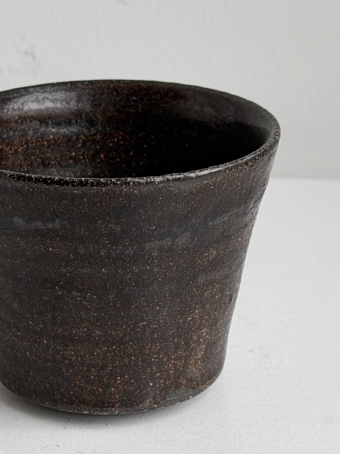 Kristine Vedel Adeltoft, en keramiker fra Falster, Danmark, skabte en hånddrejet kop med hank af groft, sort stentøj. Kruset er færdiggjort med en transparent, silkemat glasur. Koppen har en afrundet bund, der giver et behageligt greb.