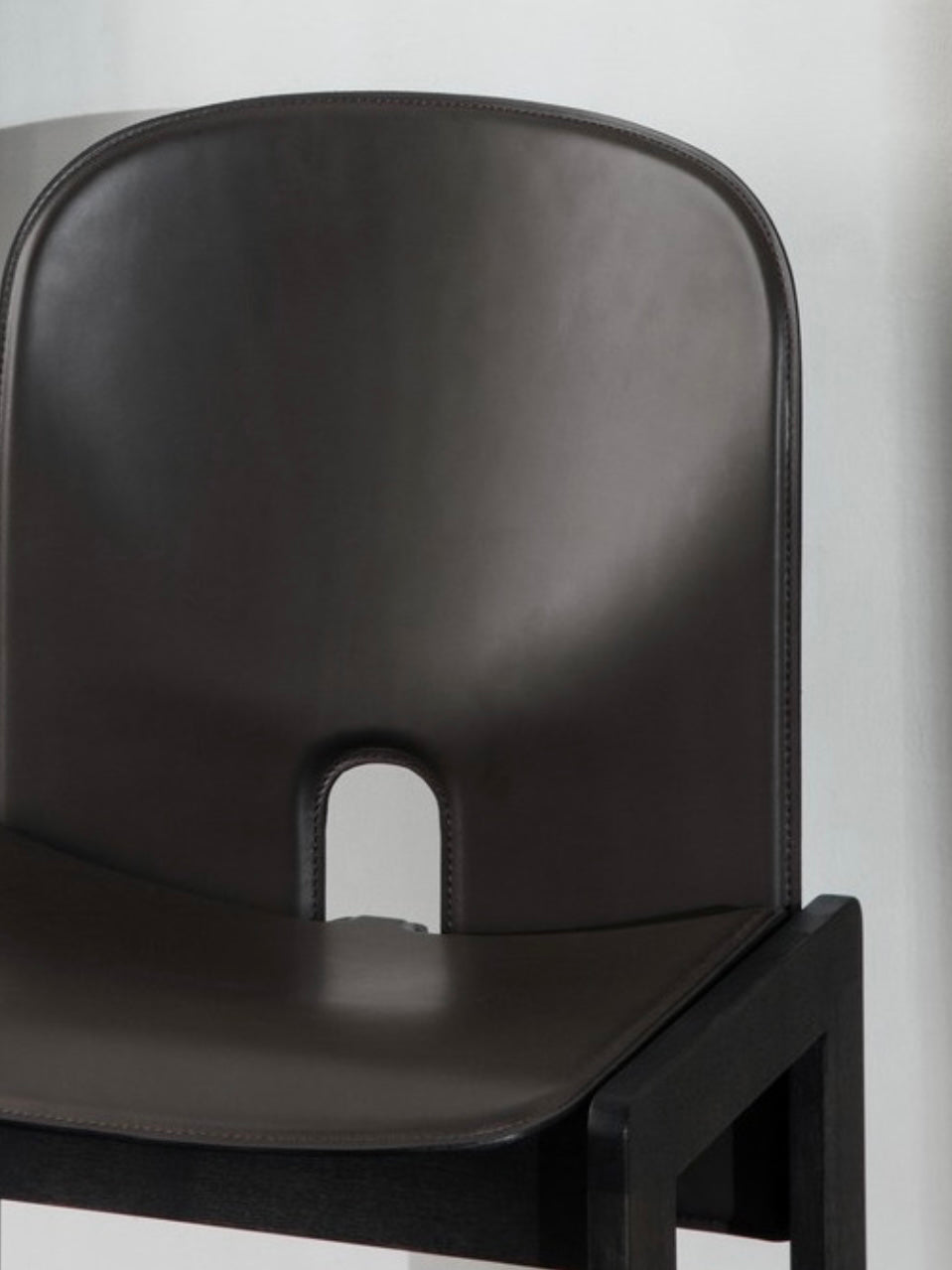 Denne stol har en solid træramme, som står i skarp kontrast til sædet og ryglænet, der er lavet af anatomisk formet krydsfiner og polstret med fint europæisk læder. Disse komponenter er sikkert fastgjort med bolte til tværstykkerne langs midten, hvilket sikrer fremragende komfort. Inspireret af en skitse af Tobias far, den anerkendte venetianske arkitekt og designer Carlo Scarpa, blev 121 stolen skabt med et unikt touch af Afra og Tobia Scarpa i 1965.
