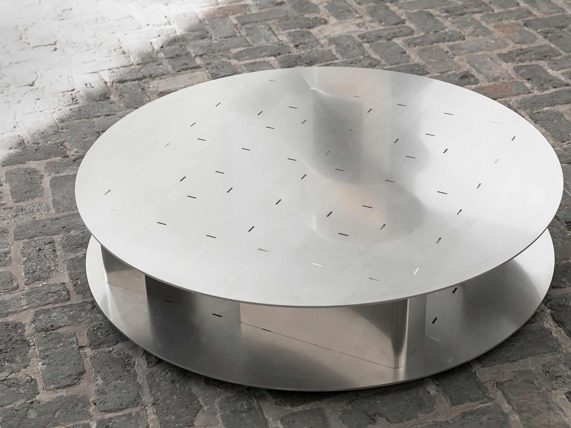 Hvert møbel er fremstillet i rå, ubehandlet aluminium af industriel kvalitet. Overfladen vil med tiden patinere naturligt, og små ujævnheder fremhæver materialets ærlige karakter.