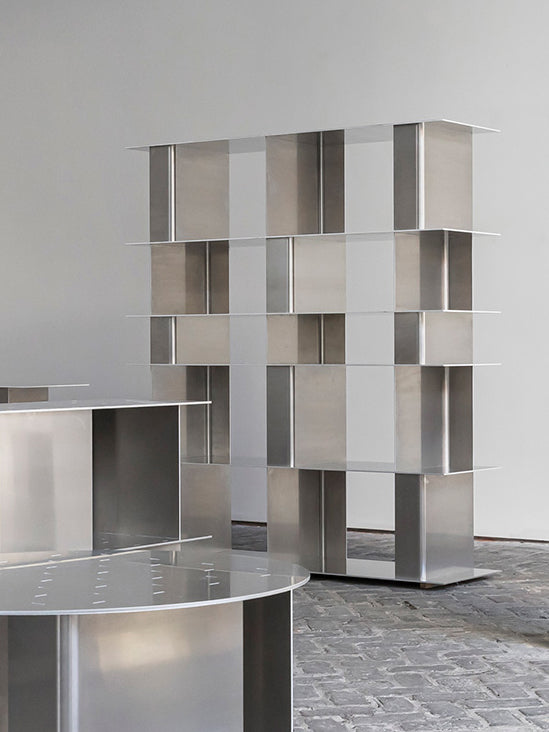 Designet af den Gent-baserede tegnestue Studio MOTO er Stack en modulær møbelserie skabt af et minimalt sæt aluminiumsdele. Systemet giver mulighed for at sammensætte skabe, reoler, totems og sofaborde – helt uden skruer eller mekaniske samlinger.