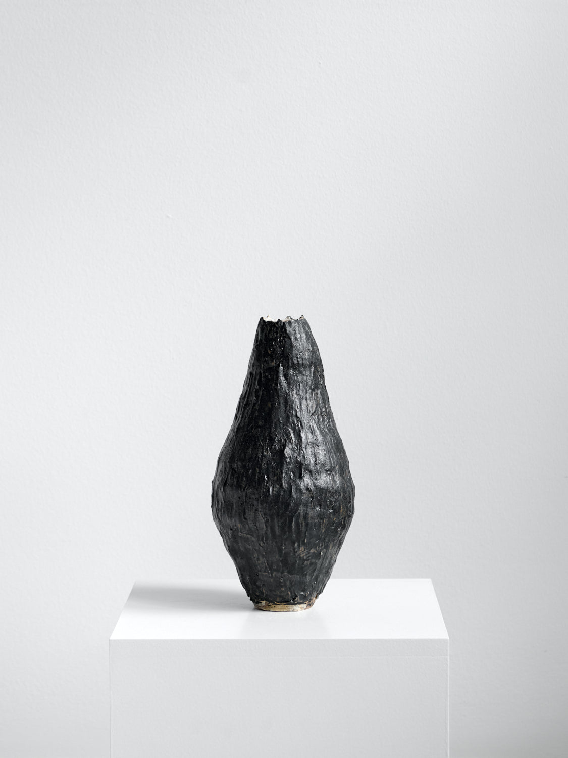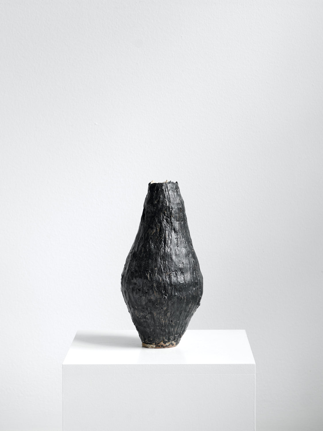 En håndbygget, aflang vase med dybe riller og en barklignende overflade. Den matte, sorte finish fremhæver værkets vertikalitet og rå taktilitet.