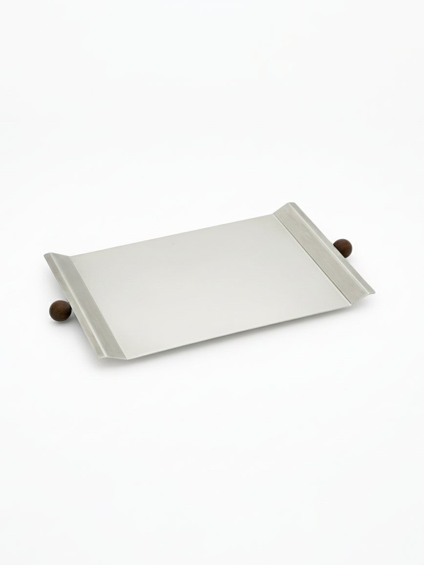 En raffineret bakke fremstillet i metal med en sølvbelagt finish. Værket er fremhævet af træhåndtag, der tilfører en varm kontrast og et markant, moderne udtryk.
